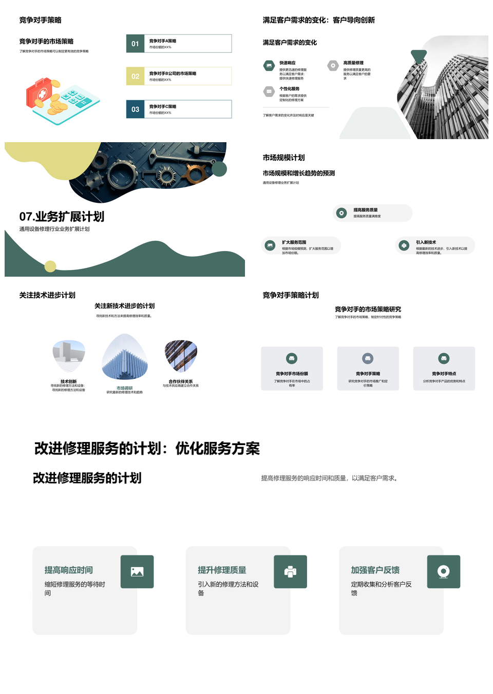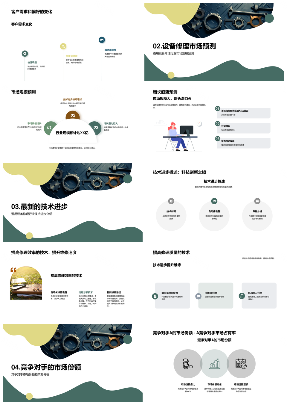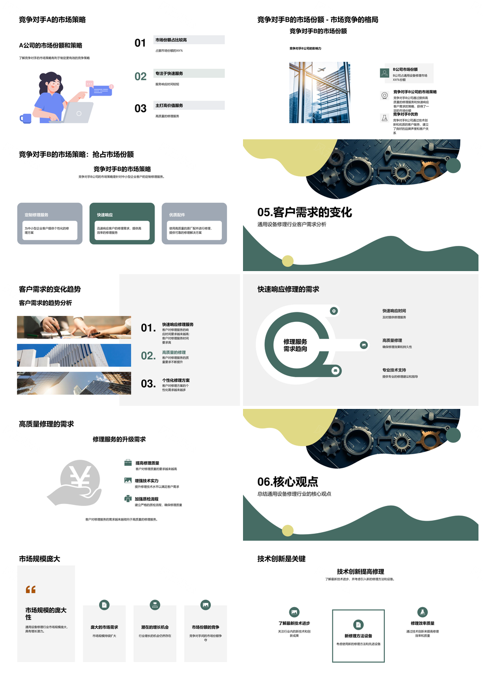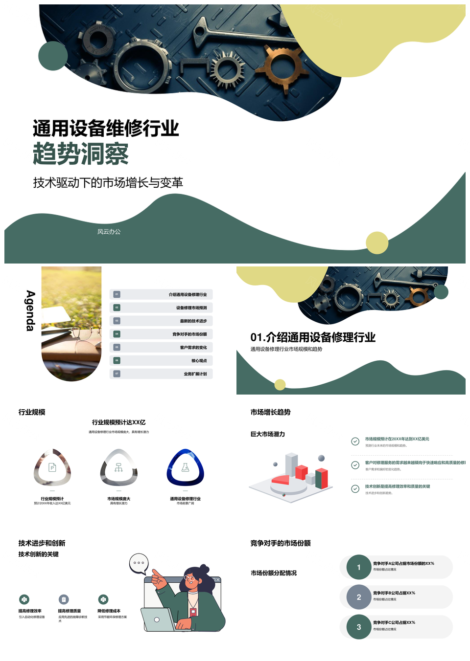 这是一张通用设备修理行业市场趋势规模增长技术创新PPT模板,包含设备修理、行业、市场趋势、规模增长、技术创新等主题内容,也可用作通用设备修理行业市场趋势规模增长、修理行业市场趋势规模增长技术创新、通用设备市场趋势规模增长技术创新、通用设备修理行业规模增长技术创新、修理行业规模增长技术创新、市场趋势规模增长技术创新、通用设备修理行业规模增长、通用设备修理行业技术创新、通用设备市场趋势技术创新、修理行业市场趋势技术创新、通用设备规模增长技术创新、市场趋势技术创新、修理行业规模增长、通用设备技术创新、市场趋势规模增长等PPT场景使用。 风云办公提供的通用设备修理行业市场趋势规模增长技术创新PPT模板,下载格式为pptx,一共35页,作品中文字及图均可以修改和编辑,图片更改请在作品中右键图片并更换,文字修改请直接点击文字进行修改。