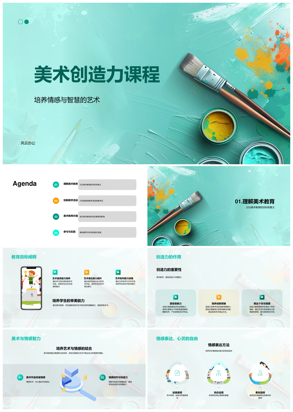 风云办公提供的美术创造力课程情感智慧创新教学艺术PPT模板,下载格式为pptx,一共27页,作品中文字及图均可以修改和编辑,图片更改请在作品中右键图片并更换,文字修改请直接点击文字进行修改。