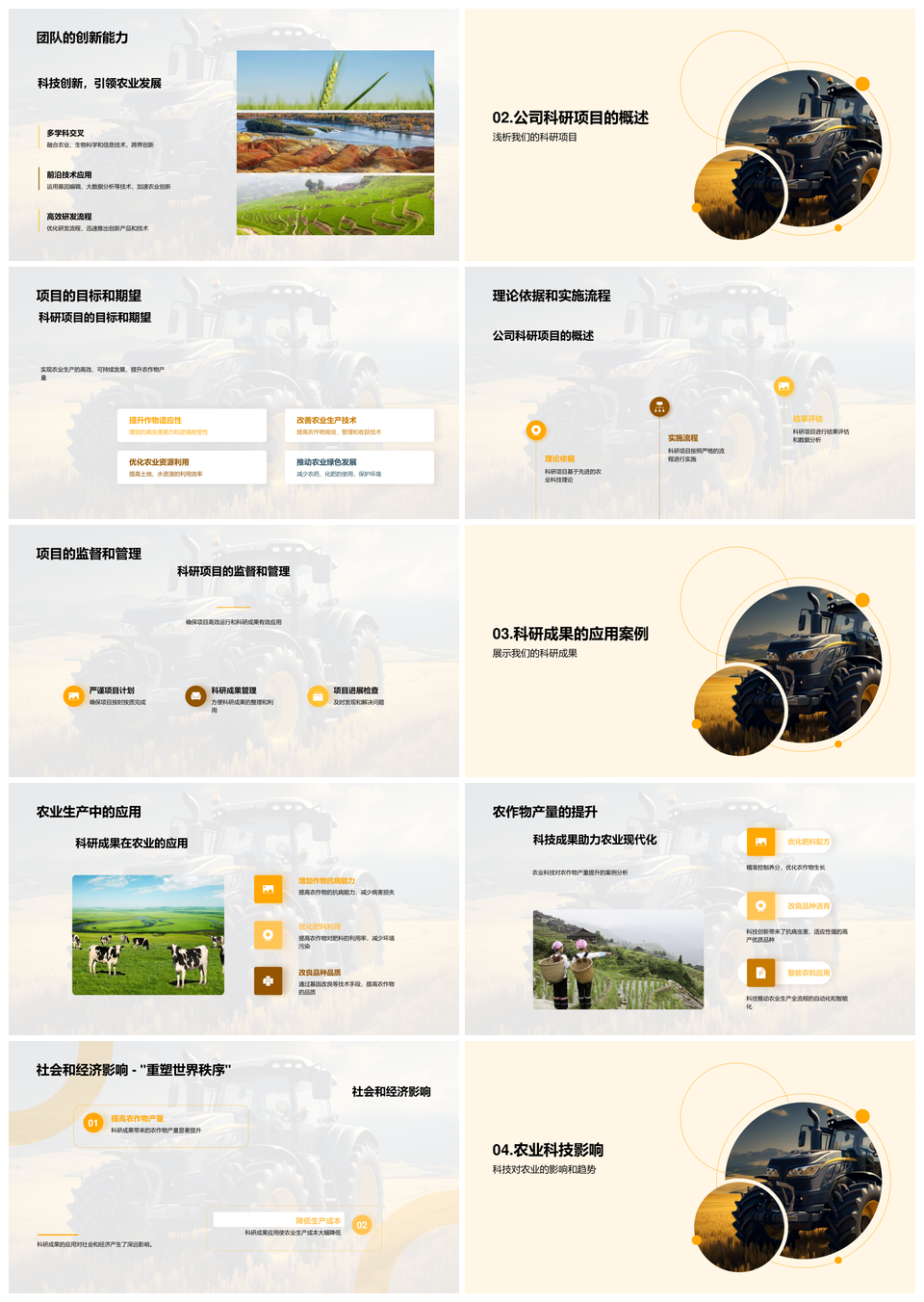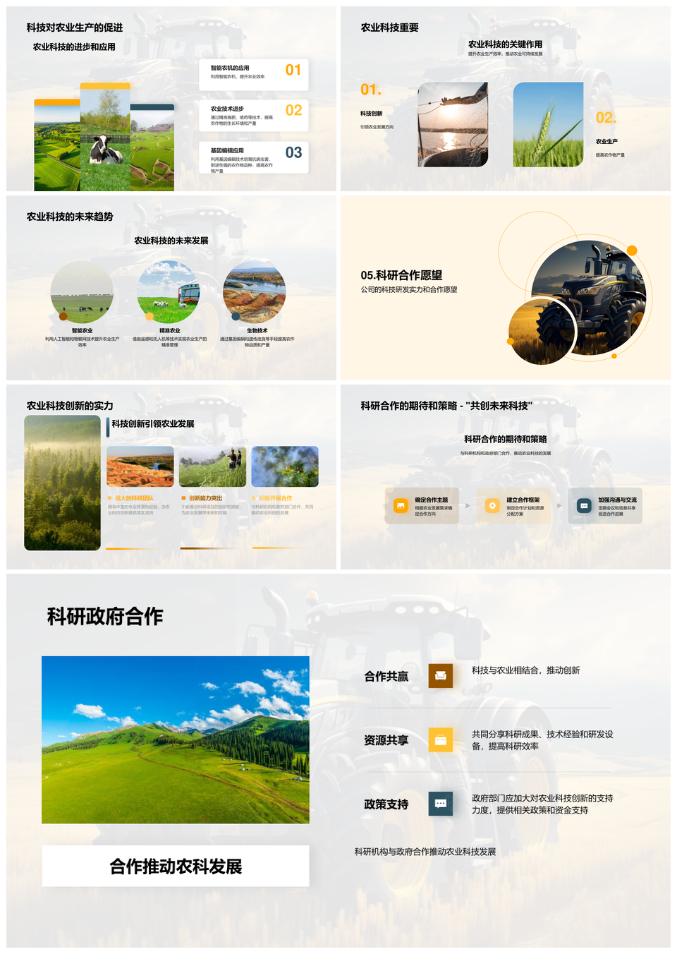 风云办公提供的科技赋能农业创新科研合作展PPT模板,下载格式为pptx,一共25页,作品中文字及图均可以修改和编辑,图片更改请在作品中右键图片并更换,文字修改请直接点击文字进行修改。