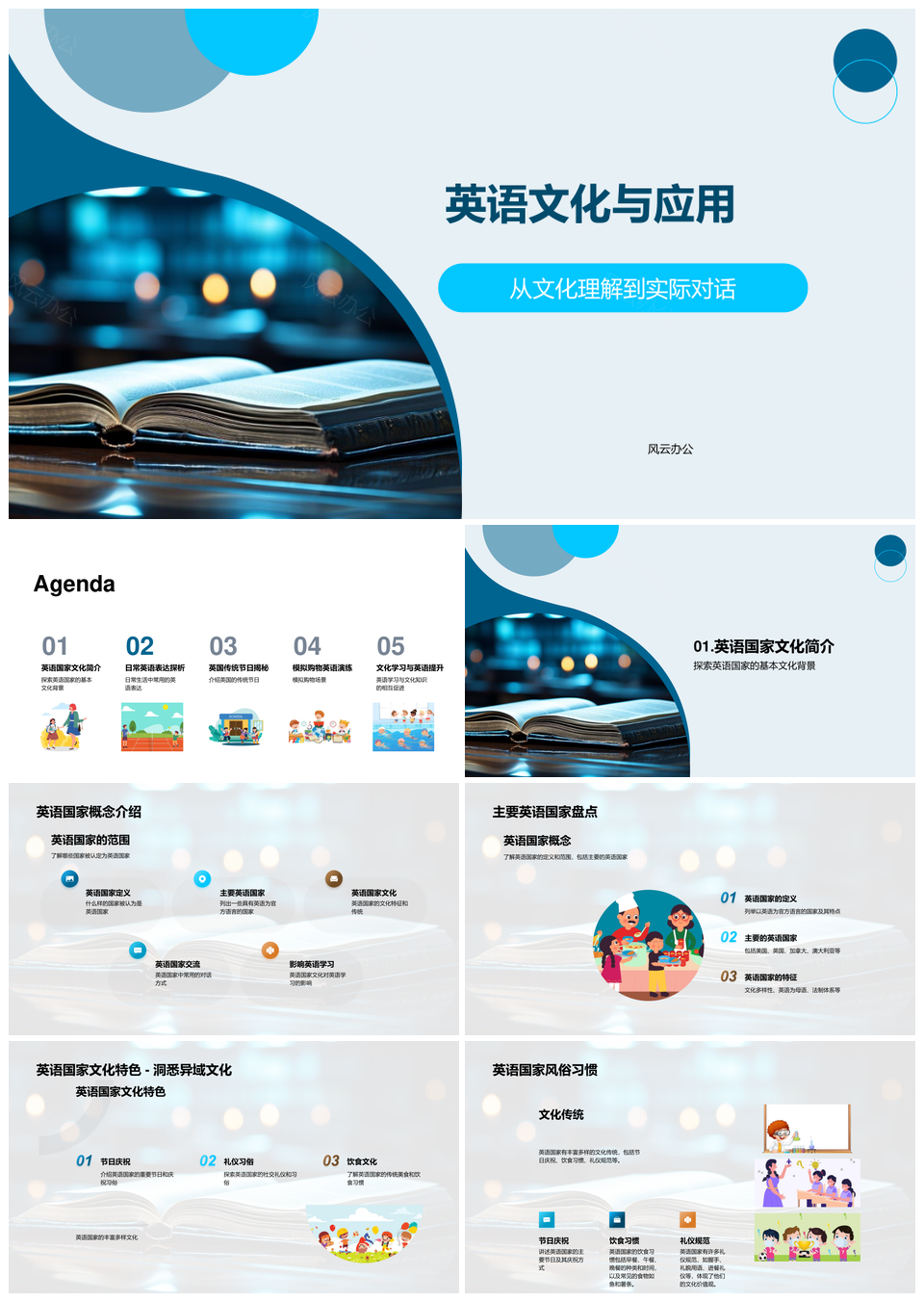 风云办公提供的英语国家文化特征与实用对话应用PPT模板,下载格式为pptx,一共24页,作品中文字及图均可以修改和编辑,图片更改请在作品中右键图片并更换,文字修改请直接点击文字进行修改。