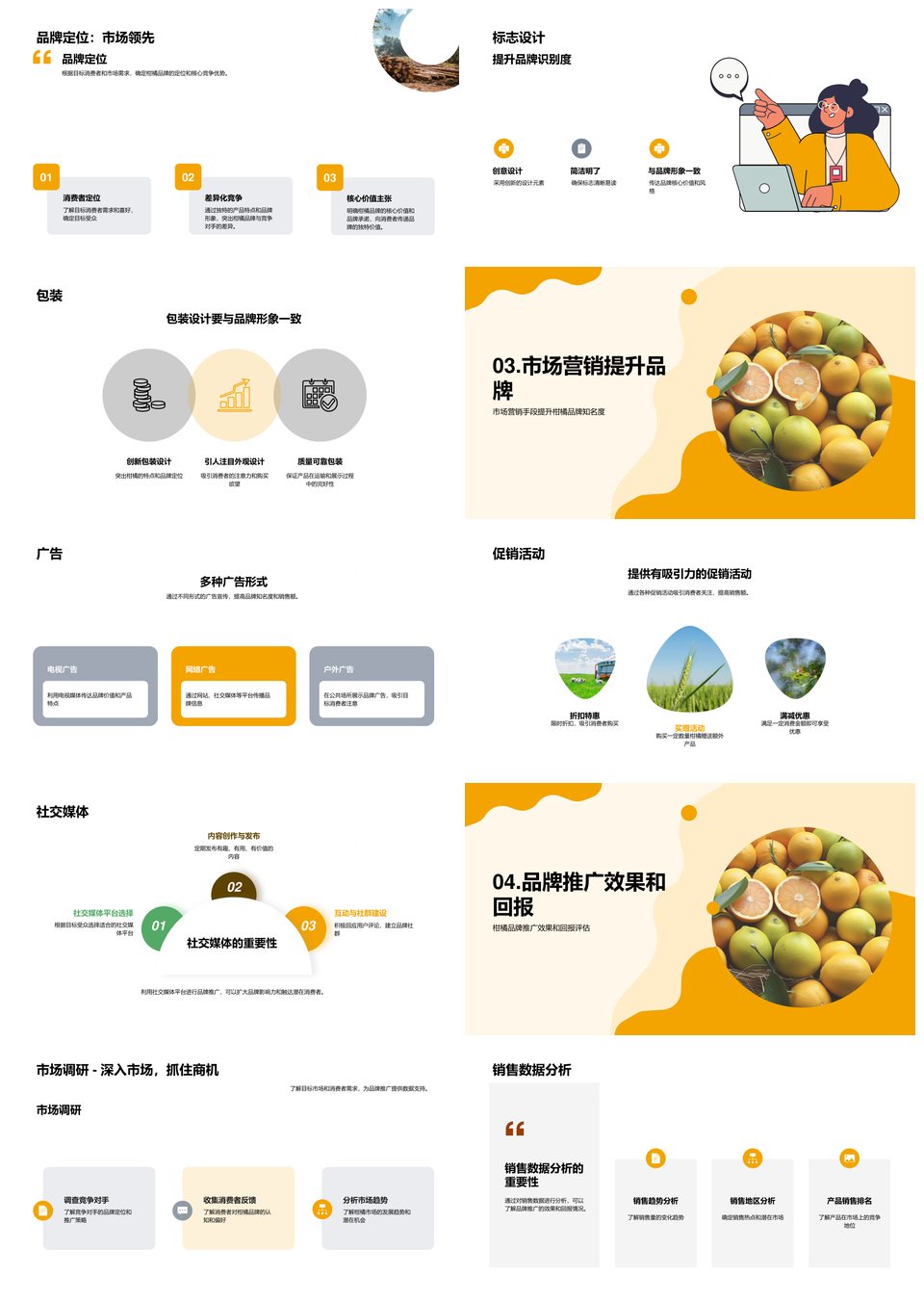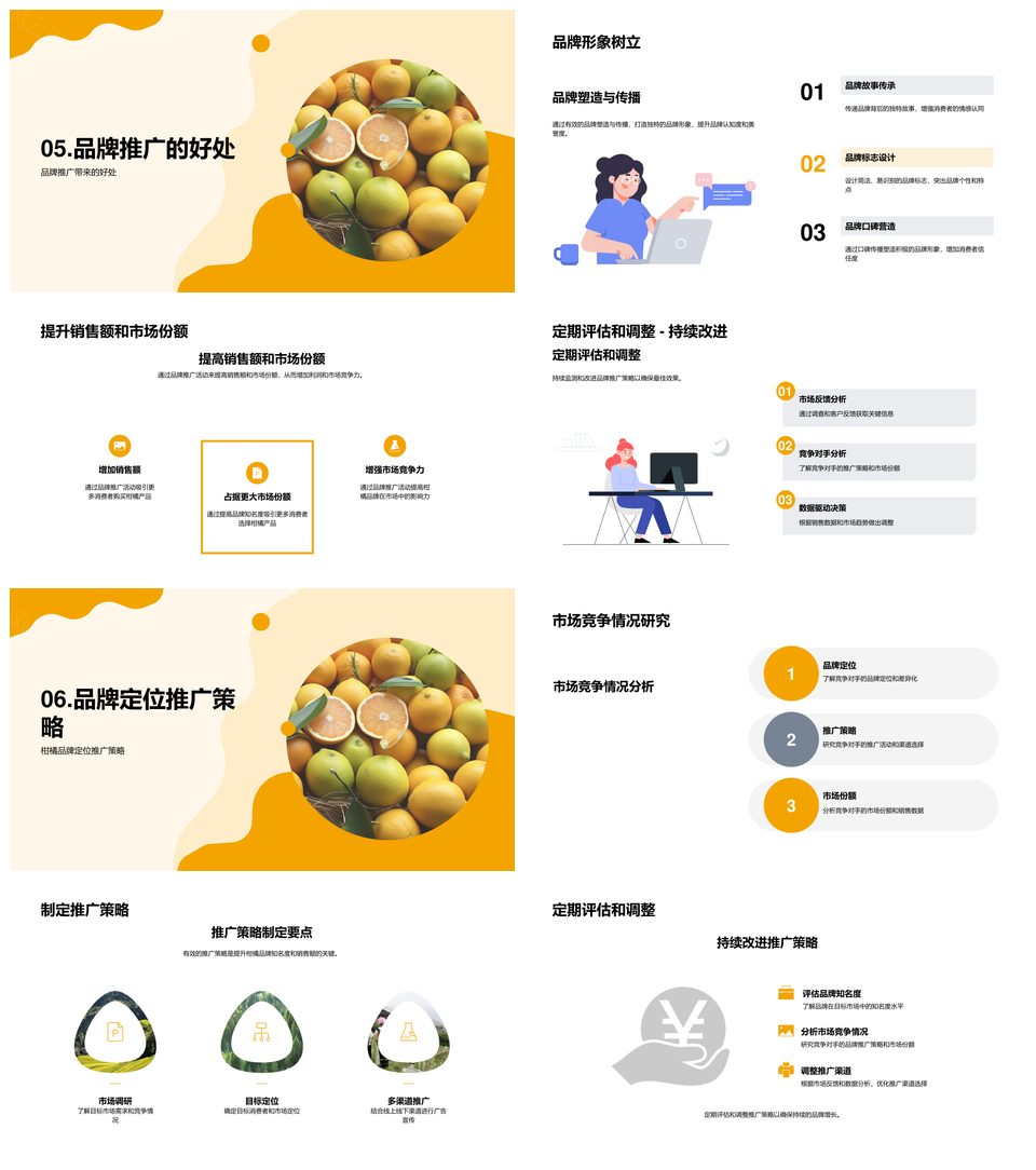 这是一张柑橘品牌市场经理推广策略提升果商知名度销售额PPT模板,包含柑橘品牌、市场经理、推广策略、提升、果商、知名度、销售额等主题内容,也可用作柑橘品牌市场经理推广策略、推广策略提升果商知名度、品牌市场经理推广策略、市场经理推广提升果商、提升果商知名度销售额、品牌推广策略提升销售额、柑橘品牌提升果商知名度、市场经理推广果商知名度、推广策略提升果商销售额、品牌策略提升果商知名度、柑橘品牌市场推广策略、市场经理策略提升销售额、品牌推广提升知名度、果商知名度销售额提升、市场推广策略销售额等PPT场景使用。 风云办公提供的柑橘品牌市场经理推广策略提升果商知名度销售额PPT模板,下载格式为pptx,一共26页,作品中文字及图均可以修改和编辑,图片更改请在作品中右键图片并更换,文字修改请直接点击文字进行修改。