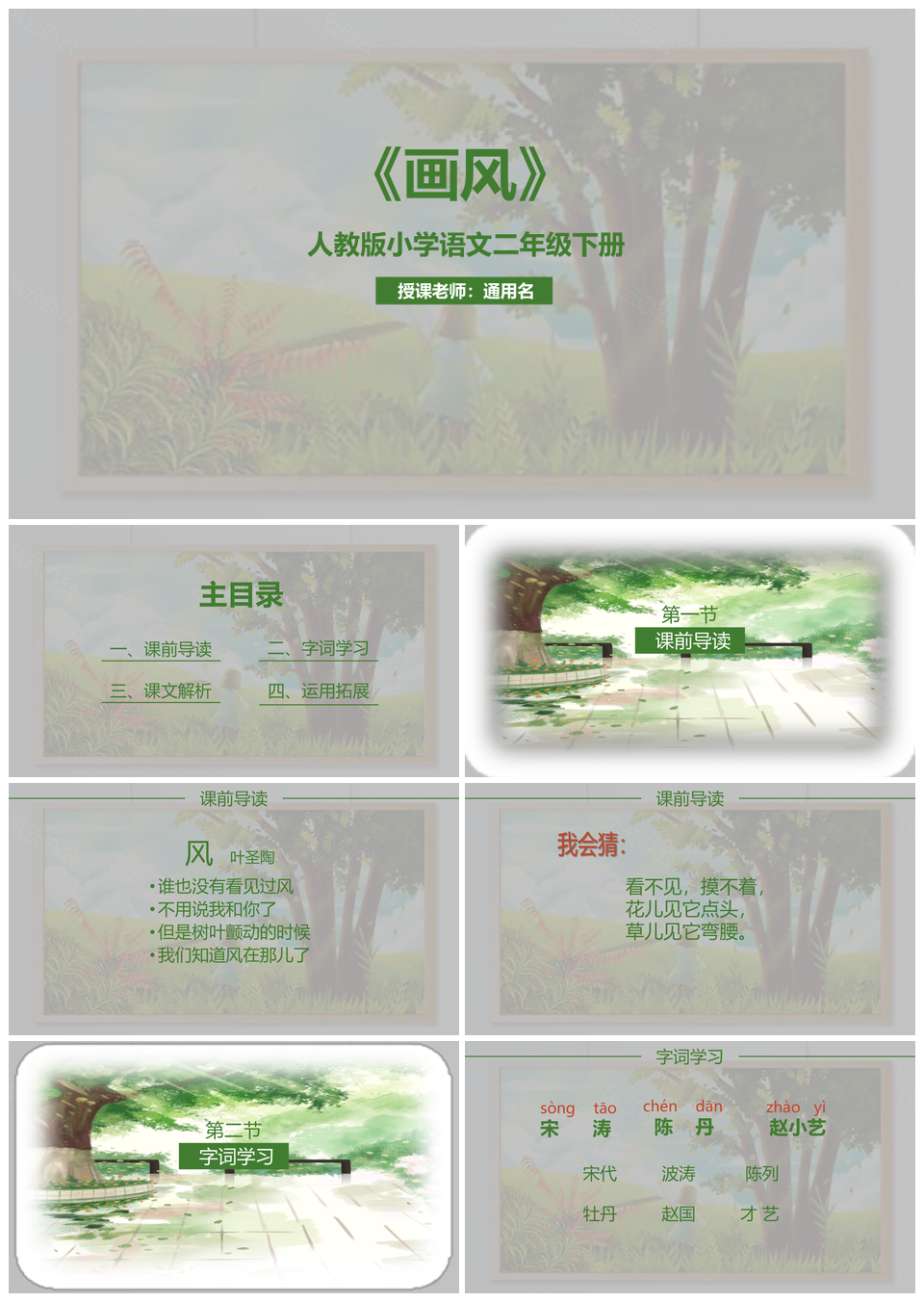 这是一张人教版小学语文二年级下册课件画风PPT模板,包含人教版、小学语文、二年级下册、课件、画风等主题内容,也可用作人教版、小学、语文、二年级、下册、课件、画风