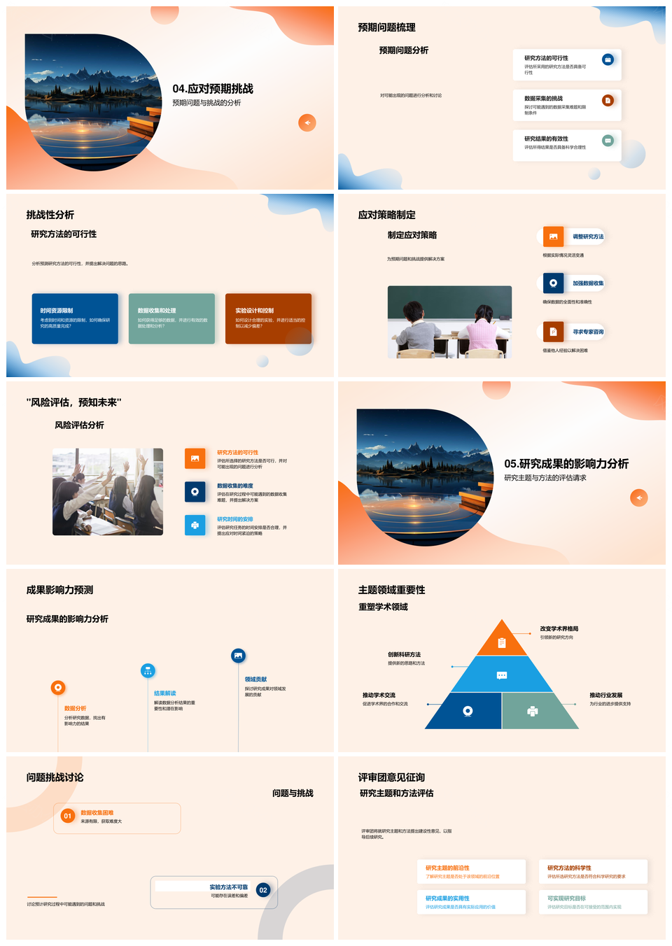 这是一张研究主题方法挑战应对与答辩探讨PPT模板,包含研究主题、方法、挑战、应对、答辩、探讨等主题内容,也可用作研究主题方法挑战、研究主题挑战应对、研究挑战应对答辩、挑战应对答辩探讨、研究主题方法应对、主题方法挑战答辩、方法挑战应对探讨、研究主题应对答辩、主题挑战应对探讨、研究答辩探讨、主题方法挑战、方法挑战应对、挑战应对答辩、应对答辩探讨、主题方法挑战应对等PPT场景使用。