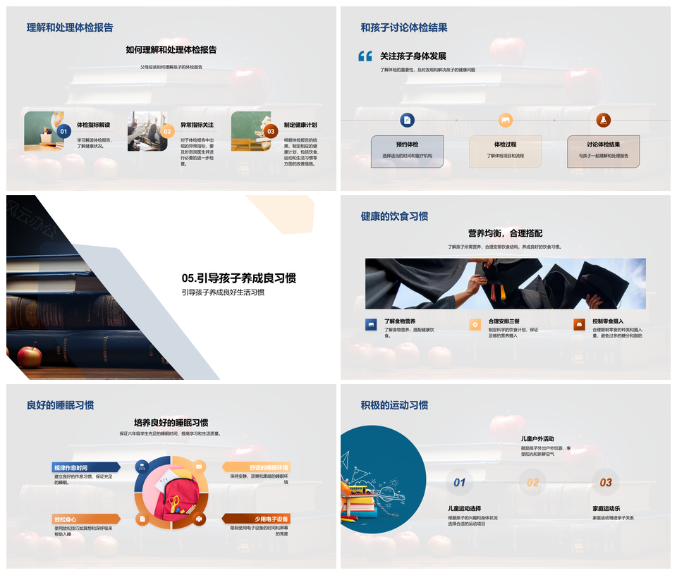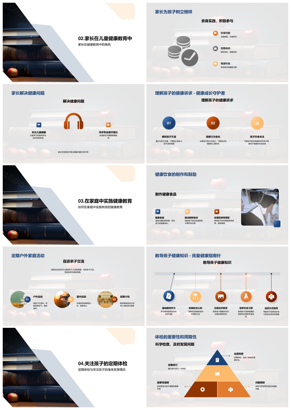 这是一张家长孩子健康生活教育饮食运动体检PPT模板,包含家长、孩子、健康生活、教育、饮食、运动、体检等主题内容,也可用作家长孩子健康生活、健康生活教育饮食、教育饮食运动体检、健康生活教育、健康饮食运动、生活教育饮食、饮食运动体检、健康教育、生活教育、健康饮食、运动体检、家长孩子健康、孩子健康生活、家长健康生活、孩子健康教育等PPT场景使用。