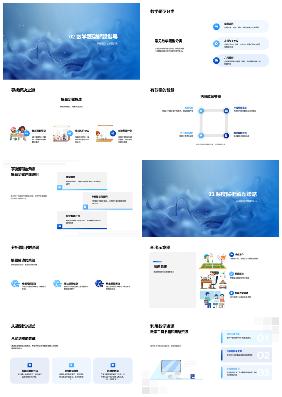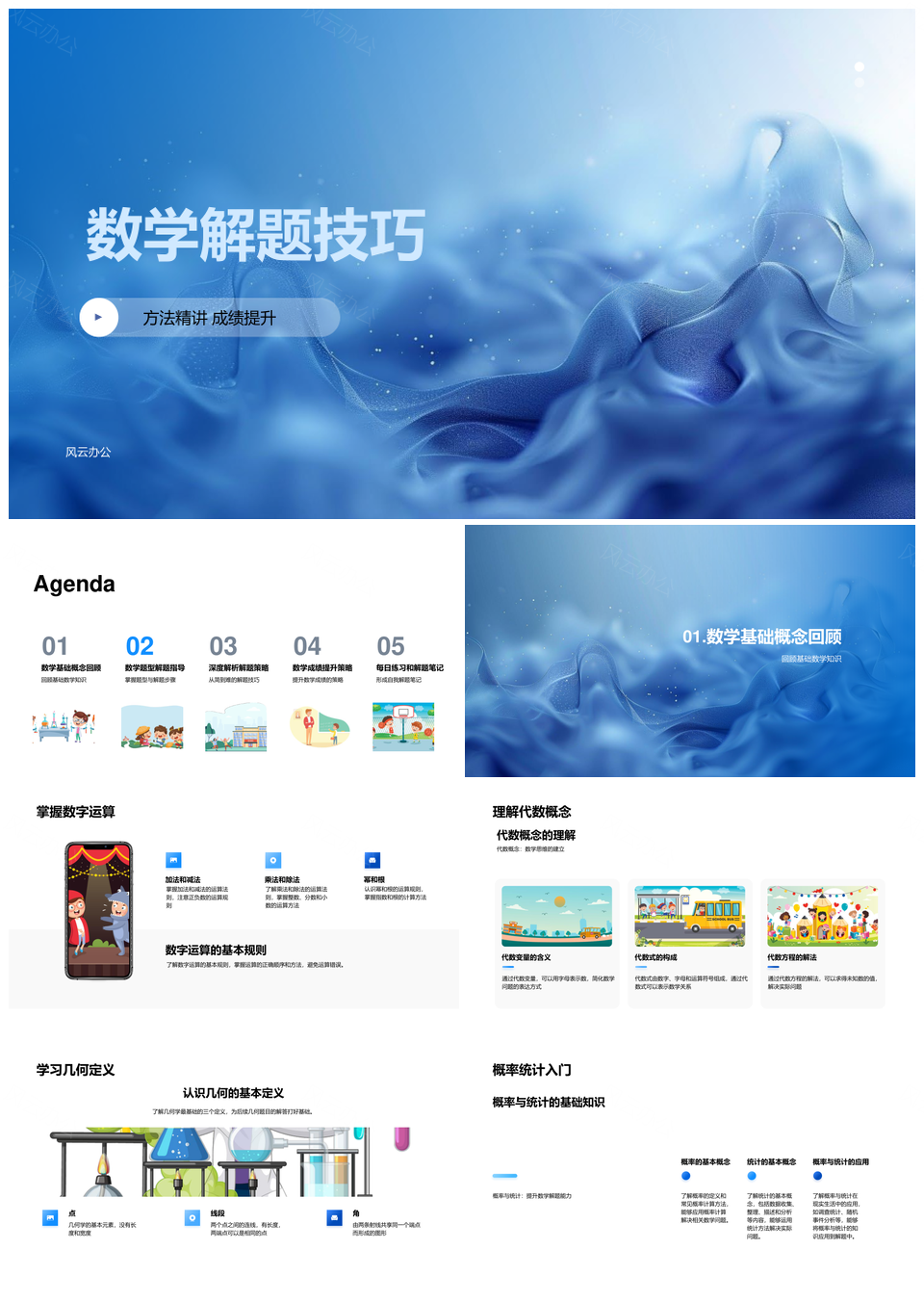 风云办公提供的数学解题技巧代数几何概率题型策略PPT模板,下载格式为pptx,一共29页,作品中文字及图均可以修改和编辑,图片更改请在作品中右键图片并更换,文字修改请直接点击文字进行修改。