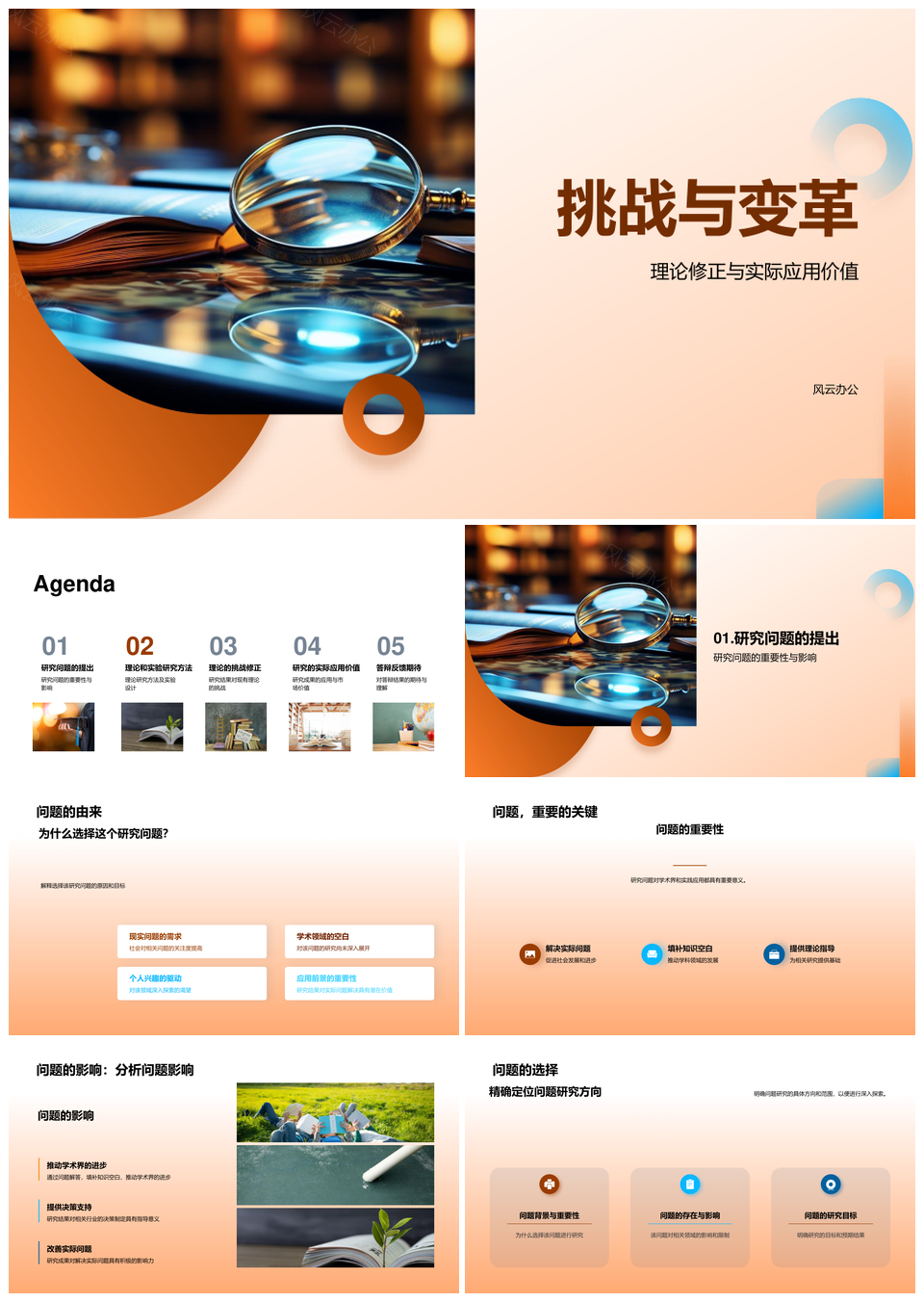风云办公提供的挑战变革理论修正与应用研究PPT模板,下载格式为pptx,一共33页,作品中文字及图均可以修改和编辑,图片更改请在作品中右键图片并更换,文字修改请直接点击文字进行修改。