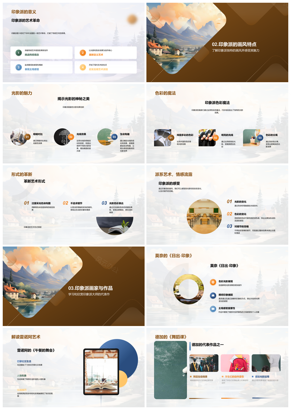 这是一张揭秘印象派艺术革命色彩光影莫奈雷诺阿德加绘画PPT模板,包含揭秘、印象派、艺术革命、色彩、光影、莫奈、雷诺阿、德加、绘画等主题内容,也可用作揭秘印象派艺术革命、印象派艺术革命色彩、艺术革命色彩光影、革命色彩光影莫奈、色彩光影莫奈雷诺阿、光影莫奈雷诺阿德加、莫奈雷诺阿德加绘画、揭秘印象派艺术、印象派艺术革命、艺术革命色彩、革命色彩光影、色彩光影莫奈、光影莫奈雷诺阿、莫奈雷诺阿德加、雷诺阿德加绘画等PPT场景使用。 风云办公提供的揭秘印象派艺术革命色彩光影莫奈雷诺阿德加绘画PPT模板,下载格式为pptx,一共28页,作品中文字及图均可以修改和编辑,图片更改请在作品中右键图片并更换,文字修改请直接点击文字进行修改。