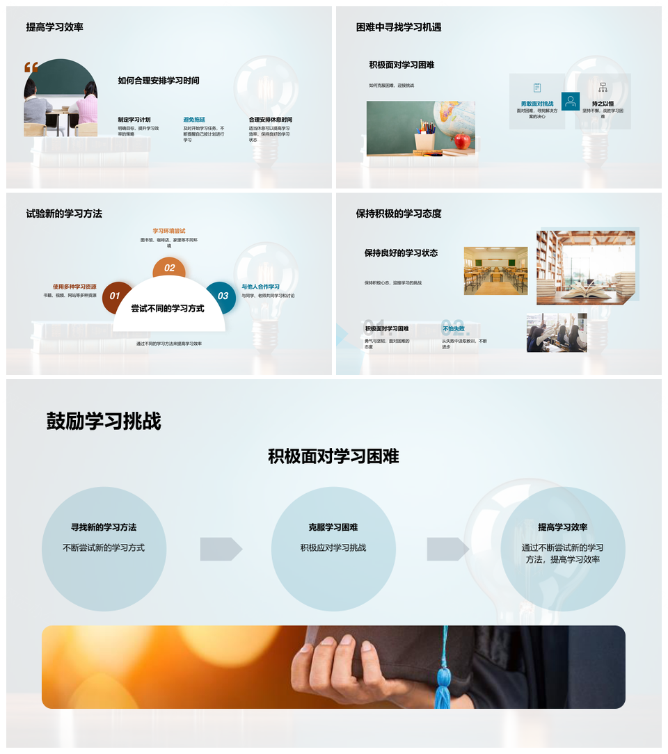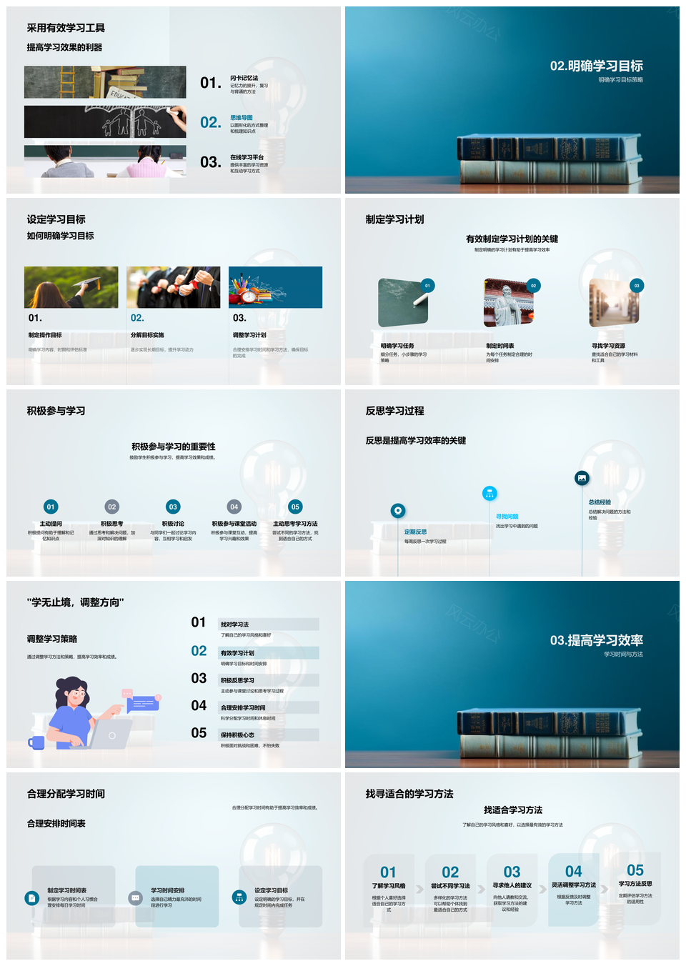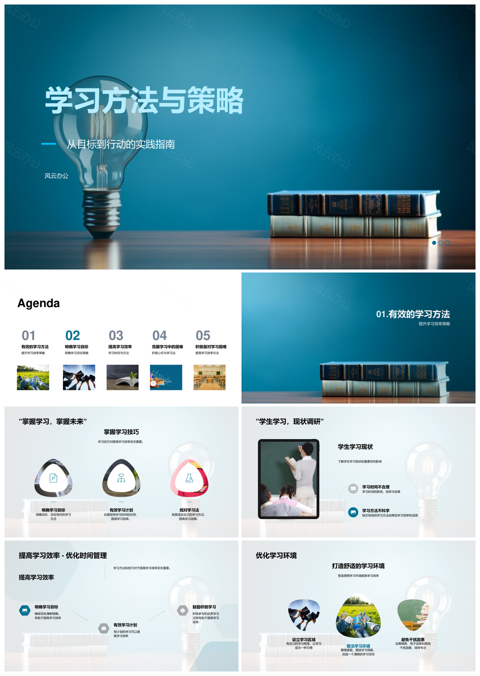 风云办公提供的高效学习策略方法目标计划环境工具书PPT模板,下载格式为pptx,一共33页,作品中文字及图均可以修改和编辑,图片更改请在作品中右键图片并更换,文字修改请直接点击文字进行修改。