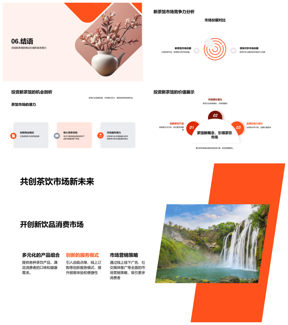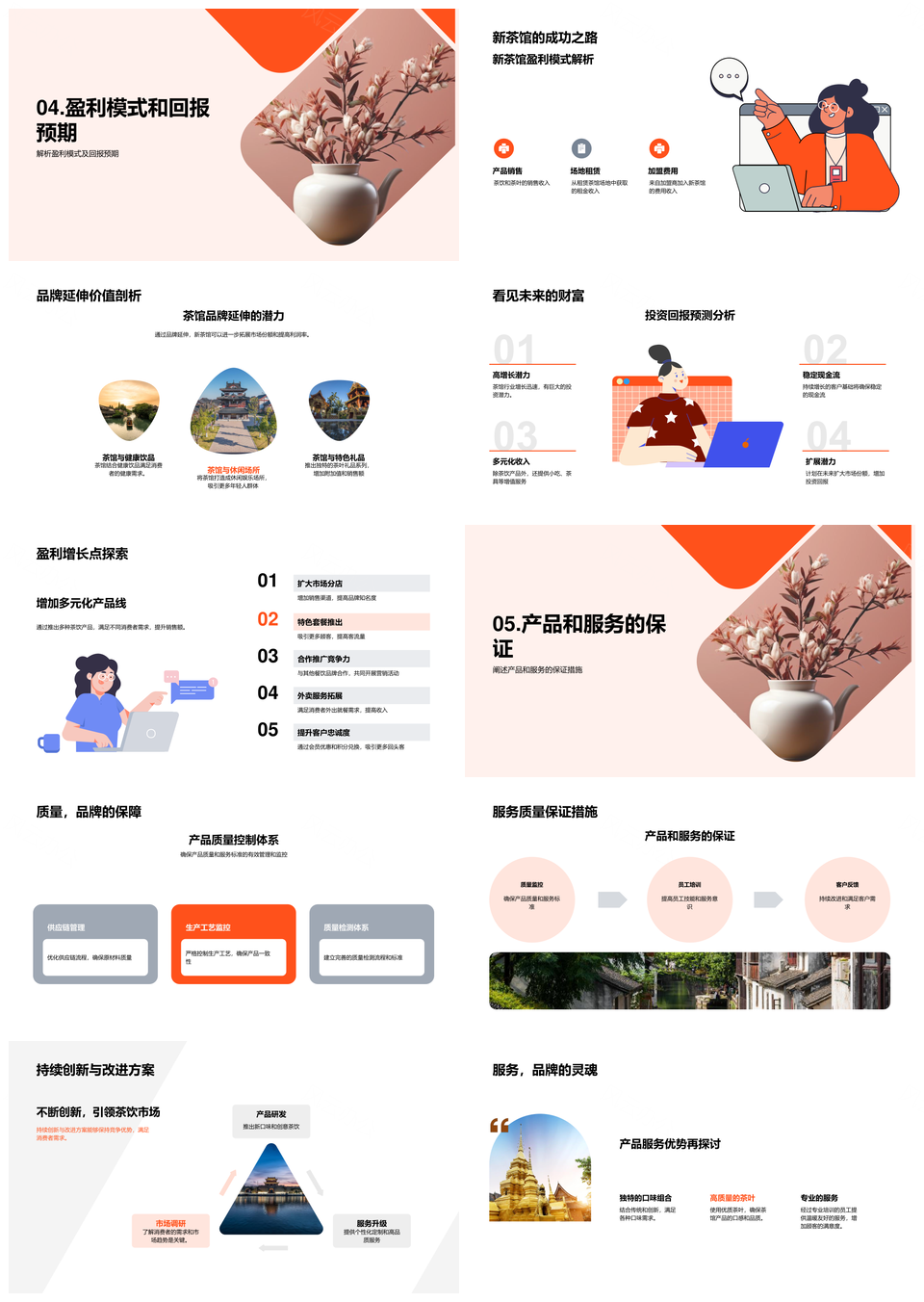 这是一张茶饮市场新茶馆投资策略商业模式盈利回报预测PPT模板,包含茶饮市场、新茶馆、投资策略、商业模式、盈利回报、预测等主题内容,也可用作茶饮市场新茶馆投资策略商业模式盈利回报预测、茶饮市场新茶馆投资策略商业模式、新茶馆投资策略商业模式盈利回报、茶饮市场新茶馆投资策略、投资策略商业模式盈利回报预测、商业模式盈利回报预测、茶饮市场新茶馆、新茶馆投资策略、投资策略商业模式、商业模式盈利回报、盈利回报预测、茶饮市场、新茶馆、投资策略、商业模式等PPT场景使用。 风云办公提供的茶饮市场新茶馆投资策略商业模式盈利回报预测PPT模板,下载格式为pptx,一共33页,作品中文字及图均可以修改和编辑,图片更改请在作品中右键图片并更换,文字修改请直接点击文字进行修改。