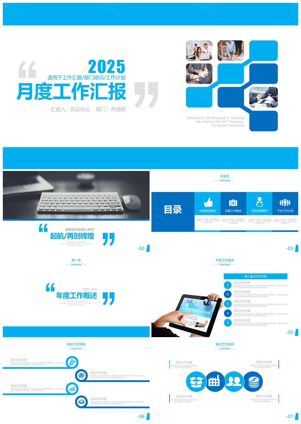 风云办公提供的2025蓝色简约大气月度工作汇报PPT模板,下载格式为,一共31页,作品中文字及图均可以修改和编辑,图片更改请在作品中右键图片并更换,文字修改请直接点击文字进行修改。