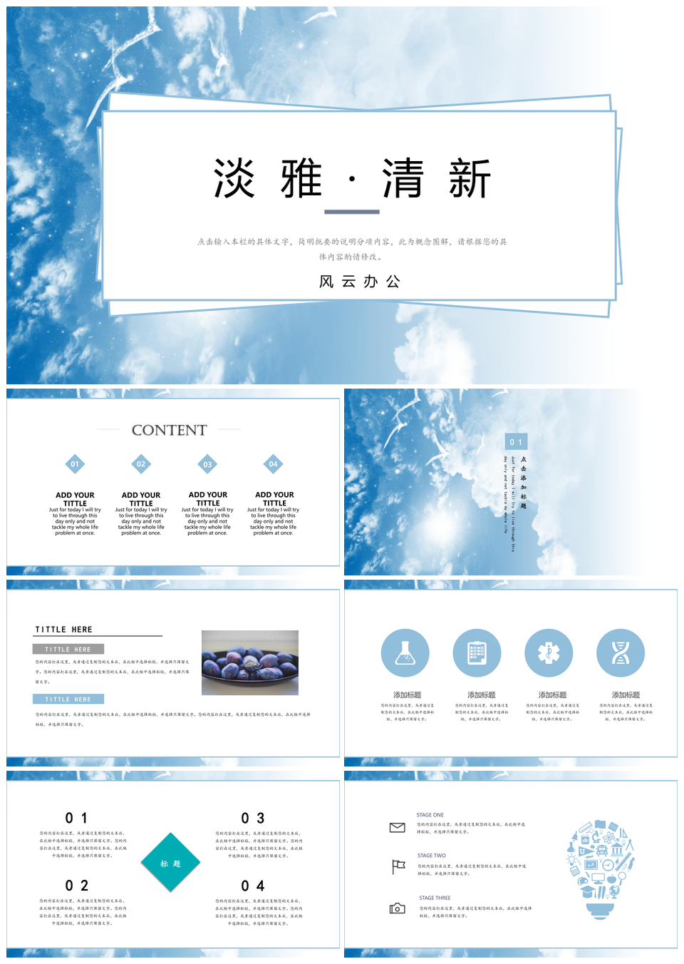 这是一张蓝色淡雅清新天空PPT模板,包含蓝色、淡雅、清新、天空等主题内容,也可用作蓝色淡雅清新天空、蓝色淡雅天空、蓝色清新天空、淡雅清新天空、蓝色淡雅、蓝色清新、蓝色天空、淡雅清新、淡雅天空、清新天空等PPT场景使用。 风云办公提供的蓝色淡雅清新天空PPT模板,下载格式为pptx,一共15页,作品中文字及图均可以修改和编辑,图片更改请在作品中右键图片并更换,文字修改请直接点击文字进行修改。