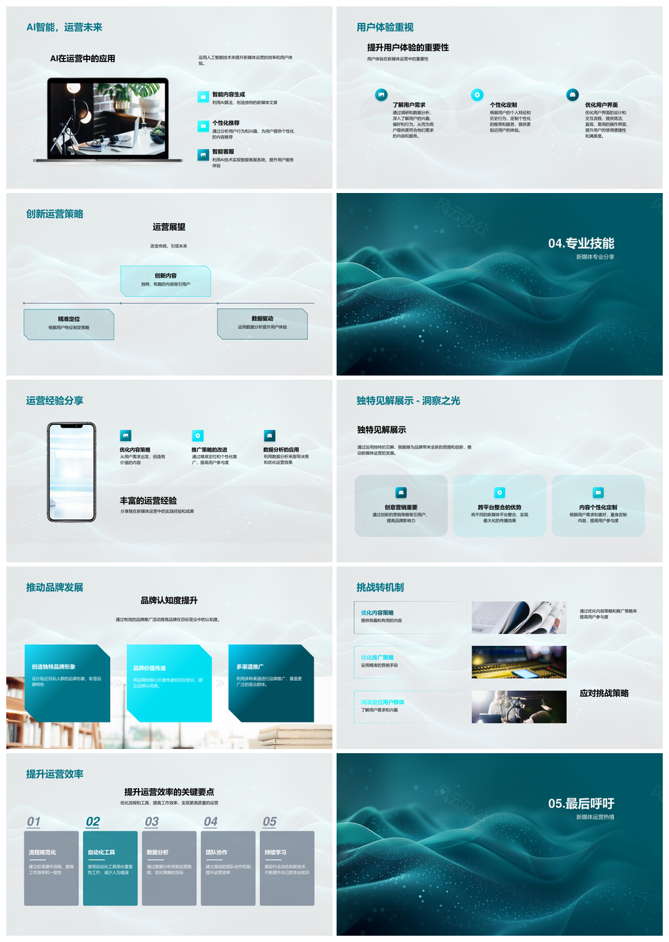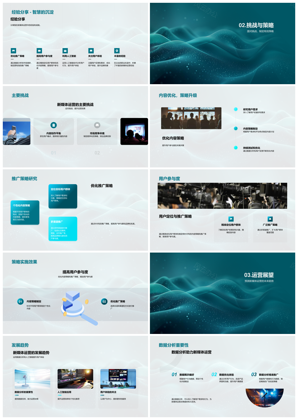 这是一张新媒体运营技能策略与数据AI经验分享PPT模板,包含新媒体运营、技能、策略、数据、AI、经验、分享等主题内容,也可用作新媒体运营技能策略、新媒体运营数据AI、新媒体运营技能数据、运营技能策略数据、技能策略数据AI、策略数据AI经验、数据AI经验分享、新媒体运营技能、运营技能策略、技能策略数据、策略数据AI、数据AI经验、AI经验分享、新媒体运营、运营技能、技能策略等PPT场景使用。 风云办公提供的新媒体运营技能策略与数据AI经验分享PPT模板,下载格式为pptx,一共33页,作品中文字及图均可以修改和编辑,图片更改请在作品中右键图片并更换,文字修改请直接点击文字进行修改。