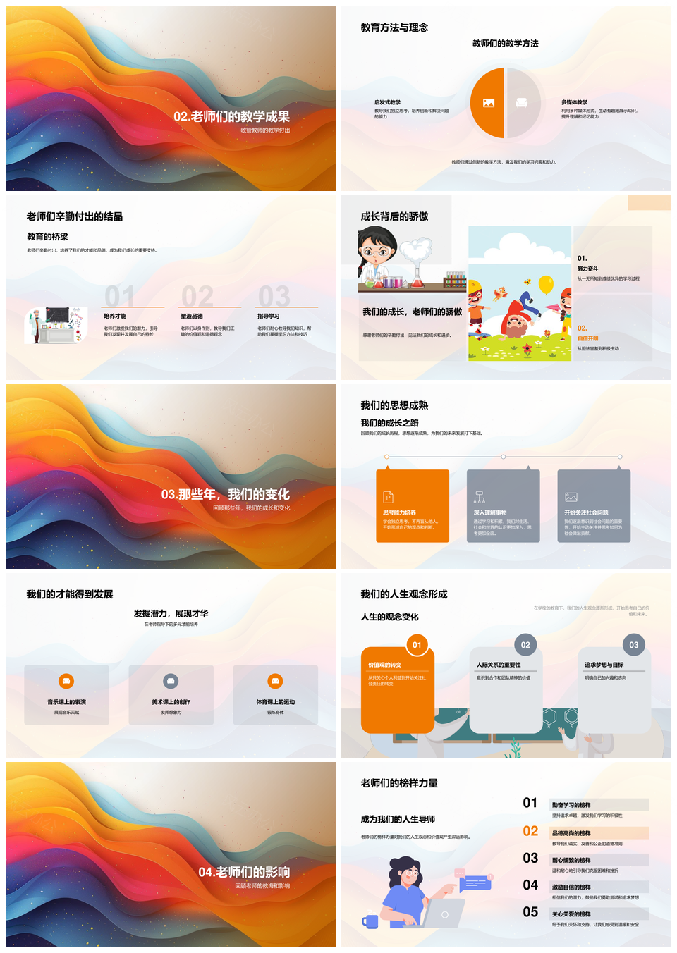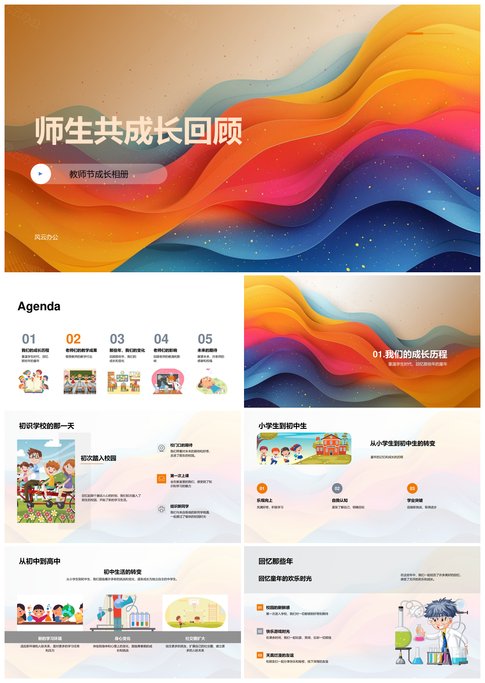 风云办公提供的师生共成长教育成果人生观念相册PPT模板,下载格式为pptx,一共24页,作品中文字及图均可以修改和编辑,图片更改请在作品中右键图片并更换,文字修改请直接点击文字进行修改。