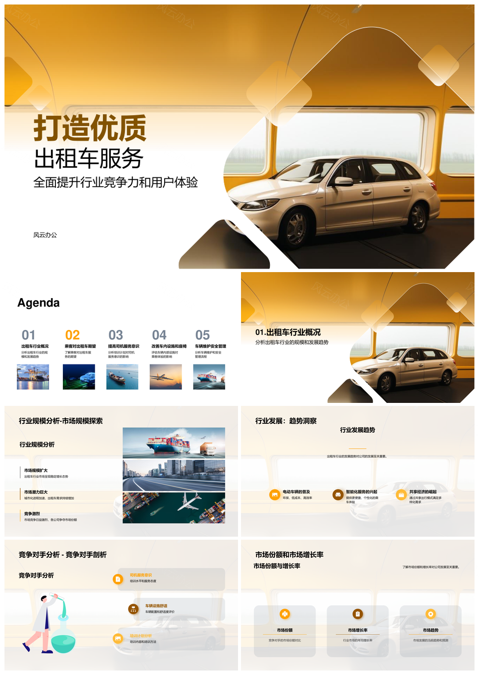 风云办公提供的出租车公司服务品质市场竞争调研分析PPT模板,下载格式为pptx,一共28页,作品中文字及图均可以修改和编辑,图片更改请在作品中右键图片并更换,文字修改请直接点击文字进行修改。