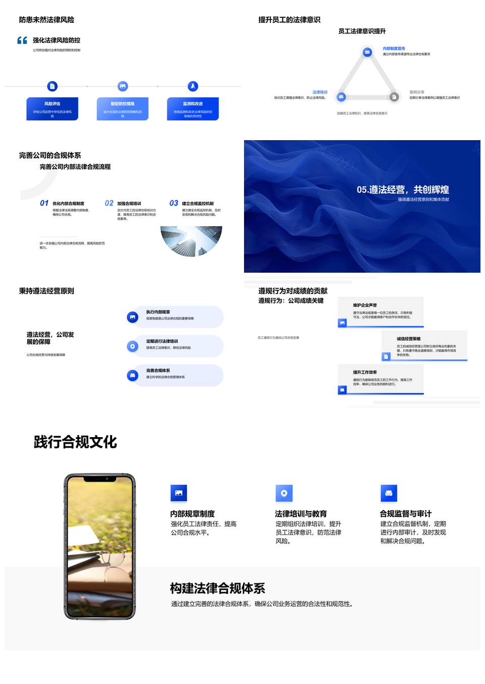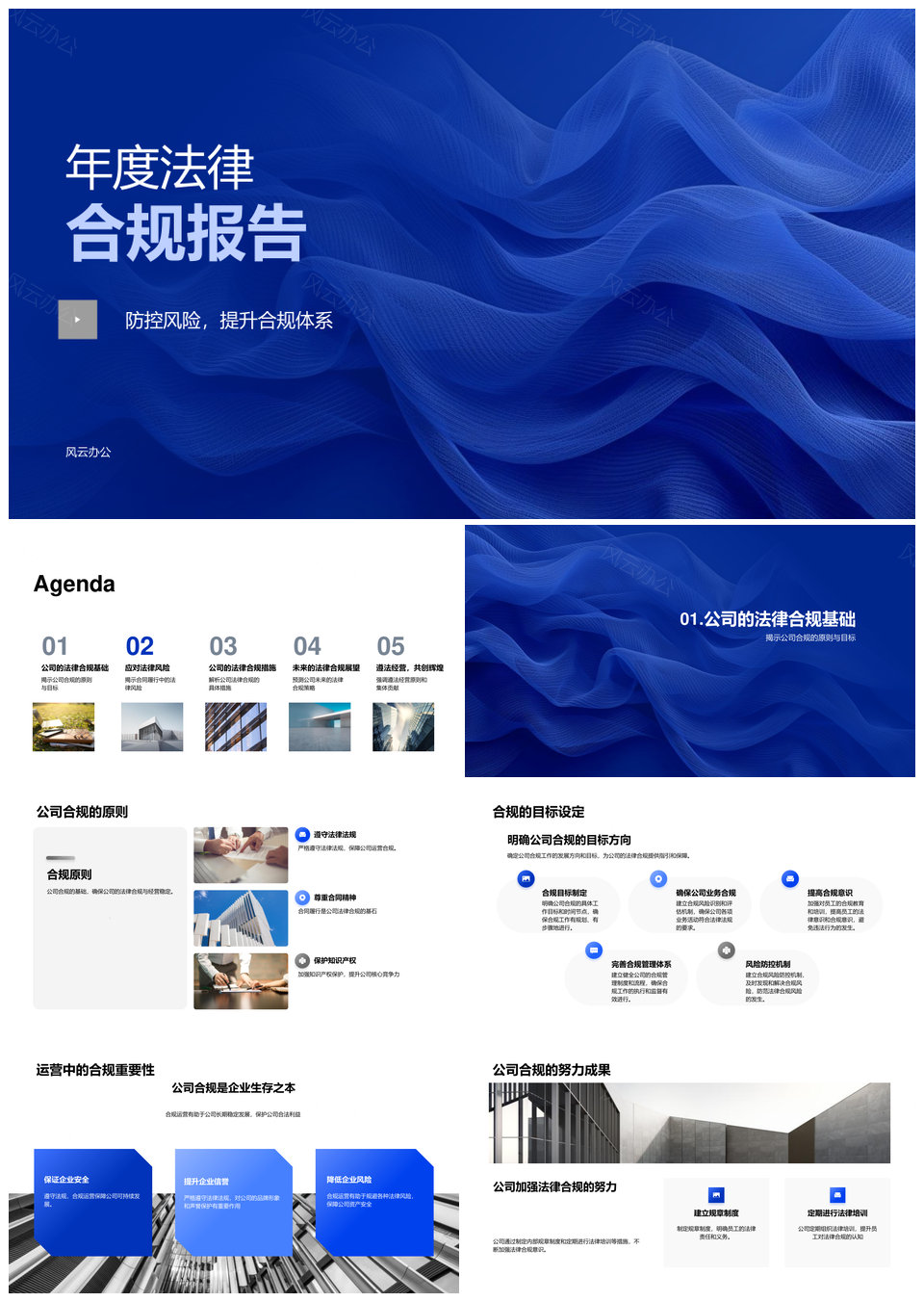这是一张法律合规风险防控体系合同知识产权税务法务培训年报PPT模板,包含法律、合规、风险、防控、体系、合同、知识产权、税务、法务、培训、年报等主题内容,也可用作法律合规风险防控体系、合规风险防控体系合同、风险防控体系合同知识产权、体系合同知识产权税务、合同知识产权税务法务、知识产权税务法务培训、税务法务培训年报、法律合规风险防控、合规风险防控体系、风险防控体系合同、体系合同知识产权、合同知识产权税务、知识产权税务法务、税务法务培训、法务培训年报等PPT场景使用。 风云办公提供的法律合规风险防控体系合同知识产权税务法务培训年报PPT模板,下载格式为pptx,一共25页,作品中文字及图均可以修改和编辑,图片更改请在作品中右键图片并更换,文字修改请直接点击文字进行修改。
