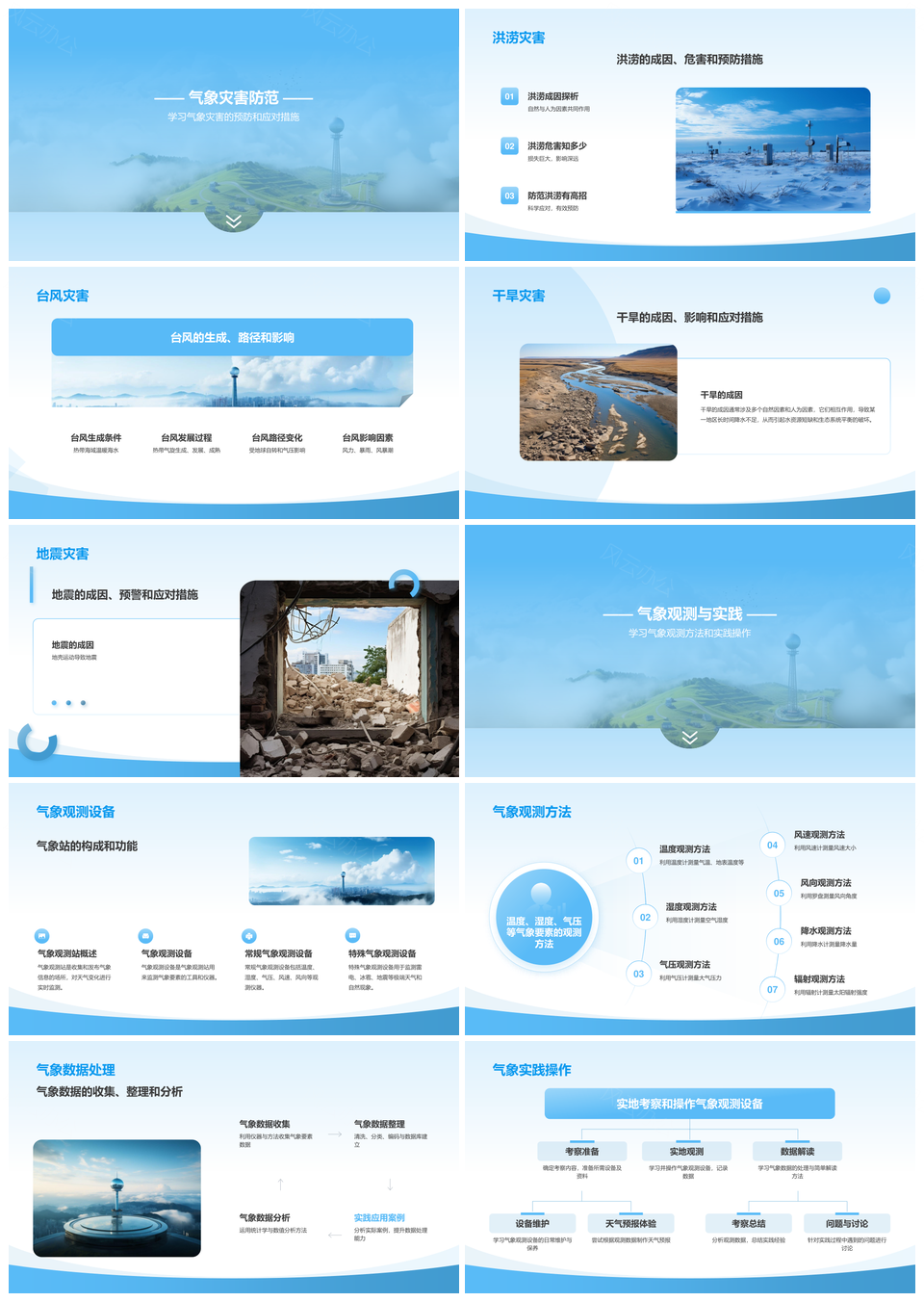 这是一张气象科普防灾减灾教育培训科学探究实践PPT模板,包含气象科普、防灾减灾、教育培训、科学探究、实践等主题内容,也可用作气象科普防灾减灾、科普防灾减灾教育、防灾减灾教育培训、教育培训科学探究、气象科普教育培训、防灾减灾科学探究、防灾减灾教育、减灾教育培训、教育培训科学、培训科学探究、科学探究实践、气象科普、防灾减灾、教育培训、科学探究等PPT场景使用。 风云办公提供的气象科普防灾减灾教育培训科学探究实践PPT模板,下载格式为pptx,一共23页,作品中文字及图均可以修改和编辑,图片更改请在作品中右键图片并更换,文字修改请直接点击文字进行修改。