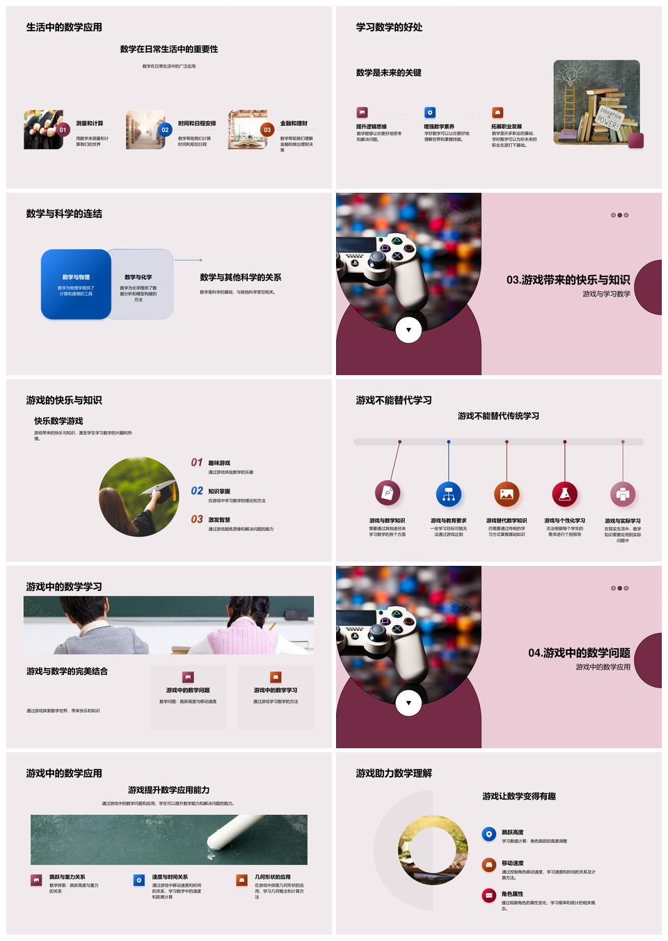 风云办公提供的游戏数学关联探索符号与学习益处PPT模板,下载格式为pptx,一共23页,作品中文字及图均可以修改和编辑,图片更改请在作品中右键图片并更换,文字修改请直接点击文字进行修改。