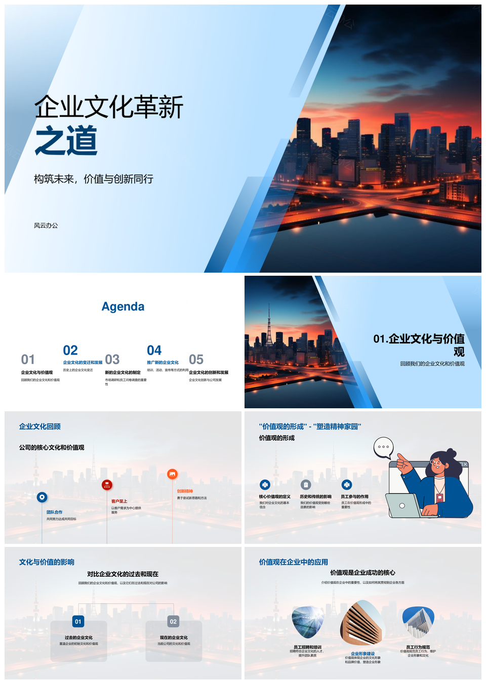 风云办公提供的企业文化革新创新价值观调研培训构建PPT模板,下载格式为pptx,一共28页,作品中文字及图均可以修改和编辑,图片更改请在作品中右键图片并更换,文字修改请直接点击文字进行修改。