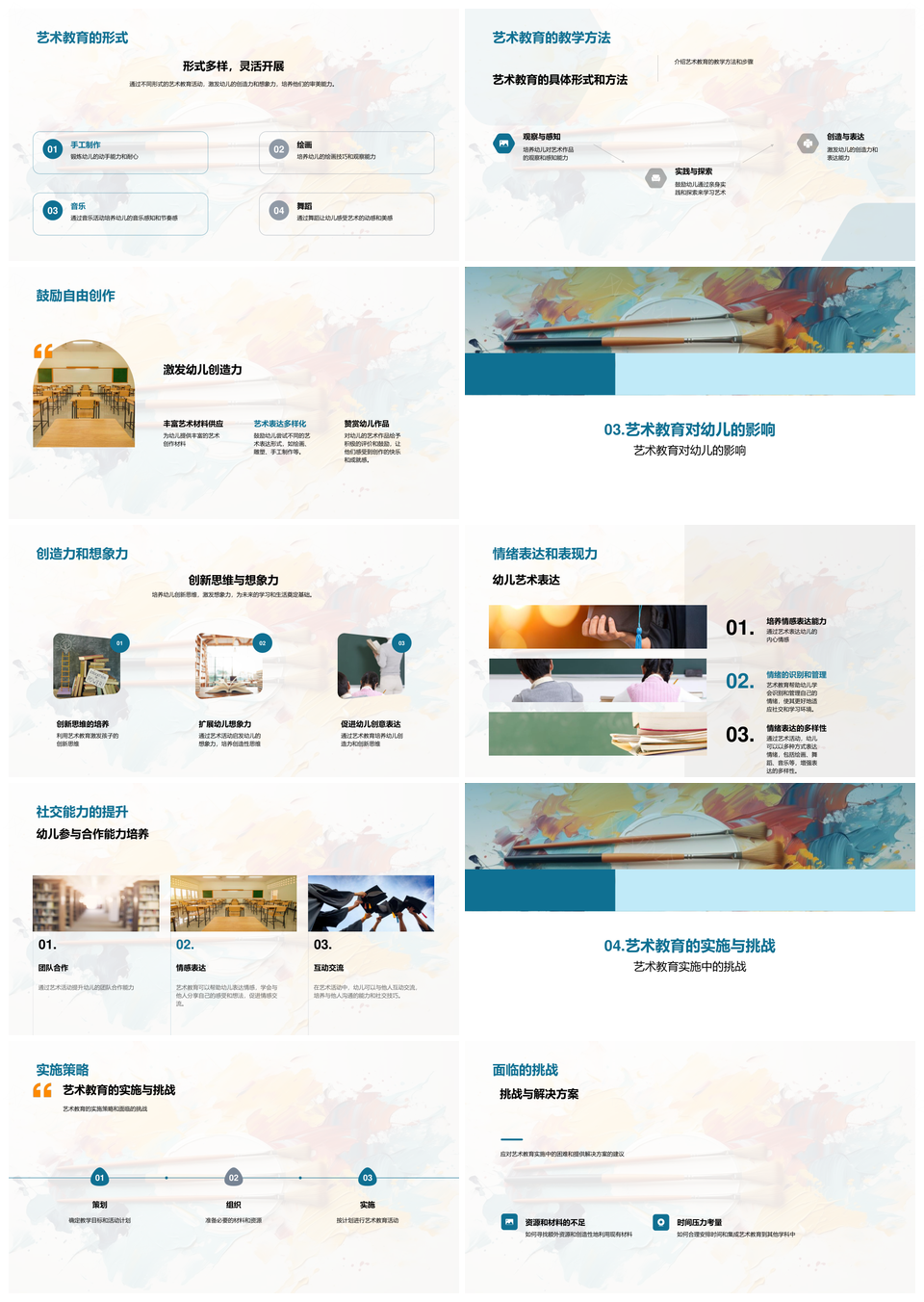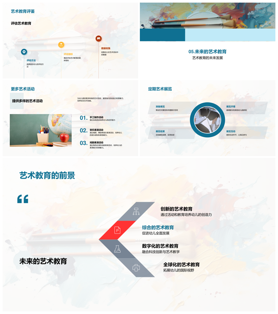 这是一张幼儿艺术教育手工绘画音乐舞蹈全面发展PPT模板,包含幼儿、艺术教育、手工、绘画、音乐、舞蹈、全面发展等主题内容,也可用作幼儿艺术教育手工绘画、艺术教育手工绘画音乐、幼儿手工绘画音乐舞蹈、手工绘画音乐舞蹈全面发展、幼儿艺术教育音乐舞蹈、艺术教育手工音乐舞蹈、艺术教育手工绘画音乐、幼儿艺术教育手工音乐、手工绘画音乐舞蹈发展、幼儿艺术教育全面发展、幼儿艺术手工绘画舞蹈、手工音乐舞蹈全面发展、艺术教育音乐舞蹈发展、幼儿手工绘画舞蹈、艺术教育绘画音乐等PPT场景使用。 风云办公提供的幼儿艺术教育手工绘画音乐舞蹈全面发展PPT模板,下载格式为pptx,一共23页,作品中文字及图均可以修改和编辑,图片更改请在作品中右键图片并更换,文字修改请直接点击文字进行修改。