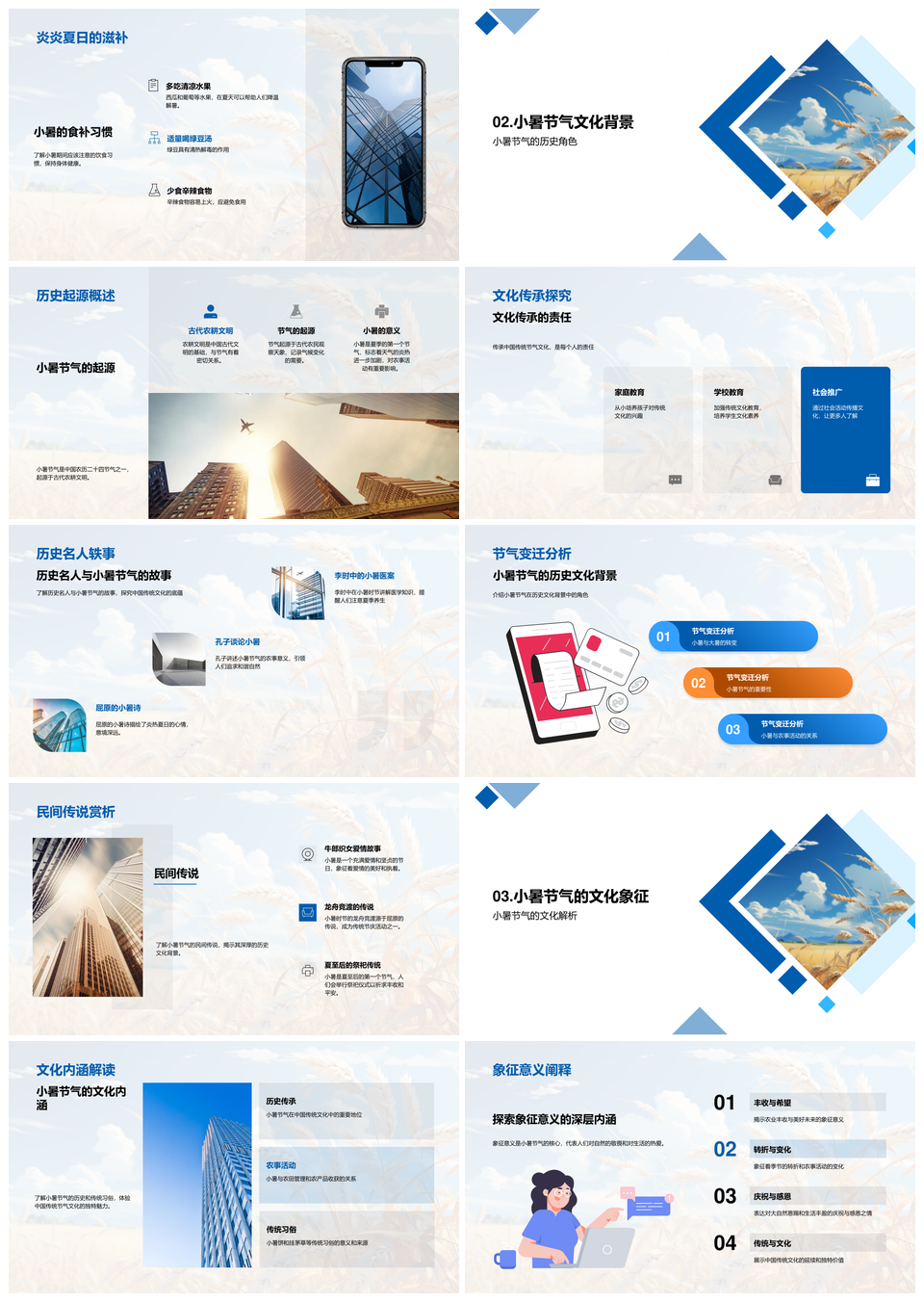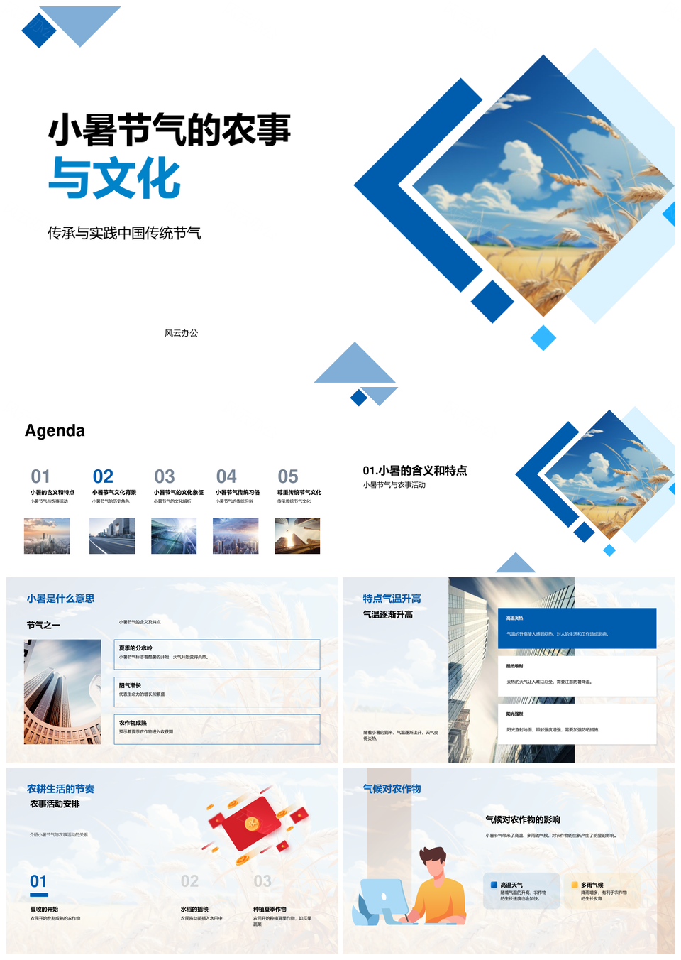 风云办公提供的小暑节气农事习俗与文化传承PPT模板,下载格式为pptx,一共33页,作品中文字及图均可以修改和编辑,图片更改请在作品中右键图片并更换,文字修改请直接点击文字进行修改。