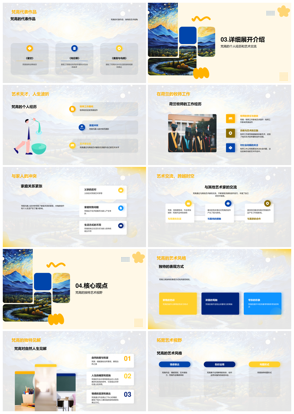 风云办公提供的初一美术课梵高生平作品教学课件,下载格式为pptx,一共22页,作品中文字及图均可以修改和编辑,图片更改请在作品中右键图片并更换,文字修改请直接点击文字进行修改。