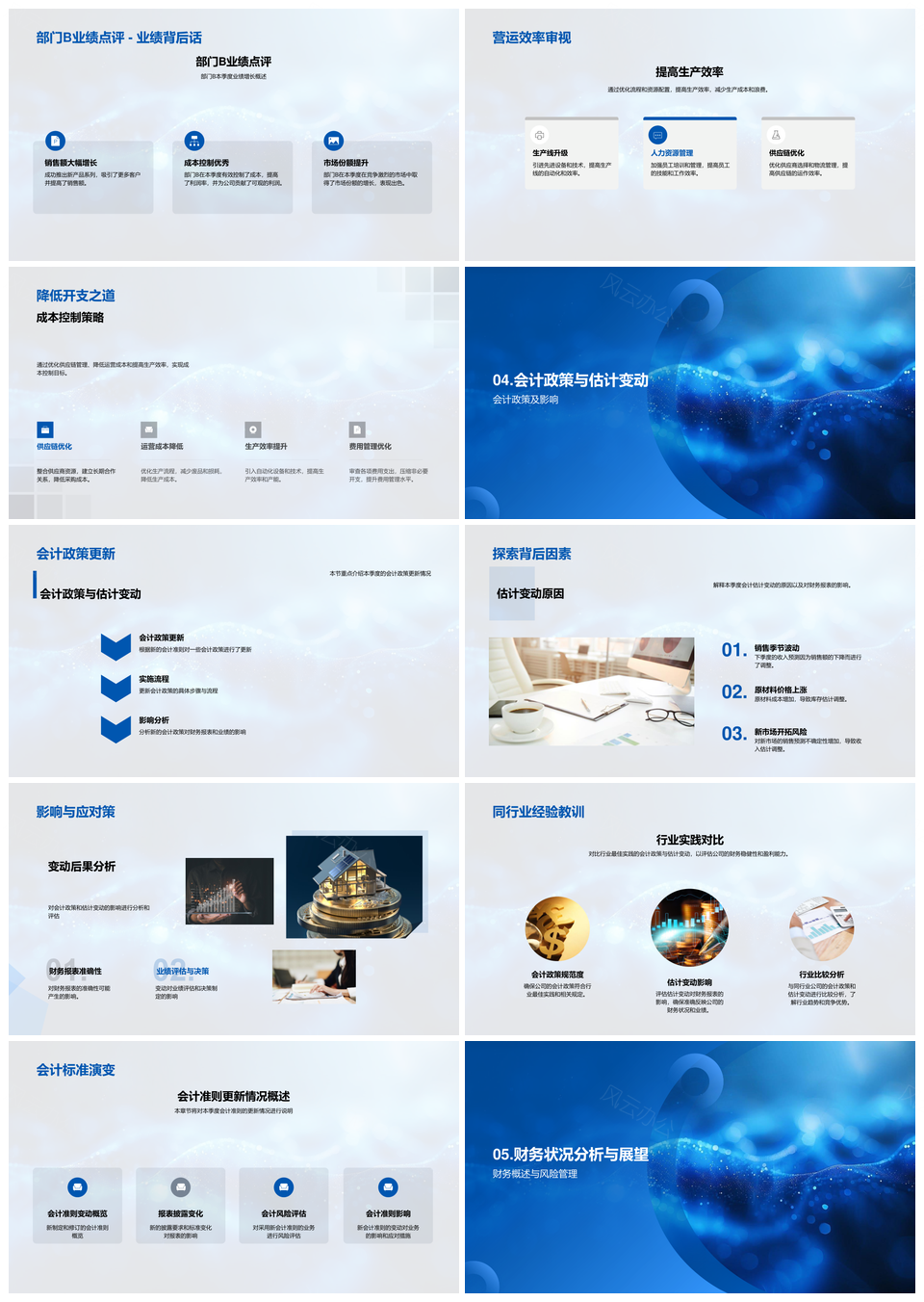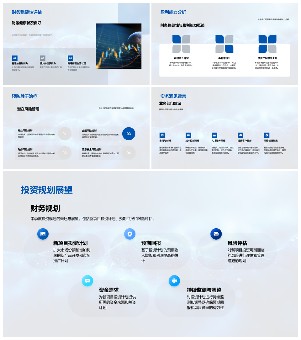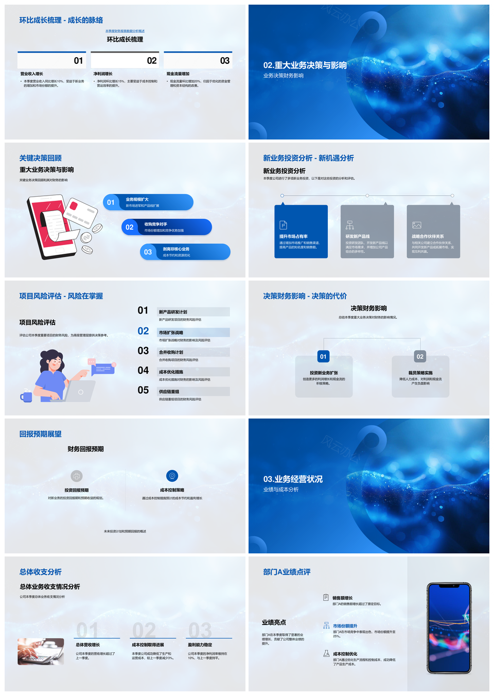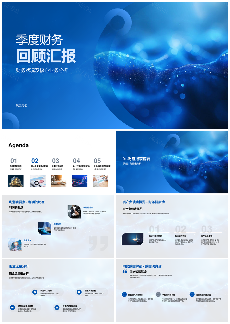 风云办公提供的季度财务核心业务与三表分析决策投资PPT模板,下载格式为pptx,一共33页,作品中文字及图均可以修改和编辑,图片更改请在作品中右键图片并更换,文字修改请直接点击文字进行修改。