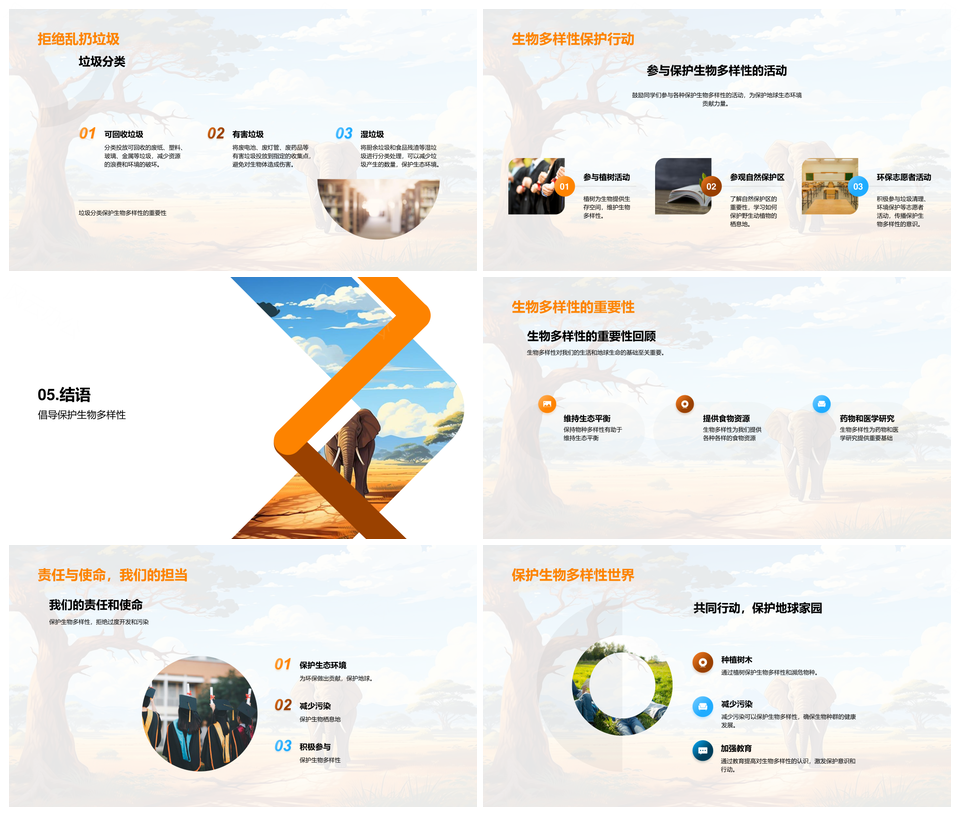 这款模板将森系的自然气息与科技风的严谨感巧妙融合,采用日系清新手绘插画搭配利落的几何图表,实现灵动与专业的平衡。页面覆盖数据可视化模块、矢量插图及分层素材,涵盖学术汇报、产品方案等多场景,可自由组合图表与手绘元素;蓝橙对比提升信息层级,保留自然治愈的氛围,通过结构化版式确保内容逻辑清晰。资源包含300+可编辑图标及15种智能图表,适配深度内容编排需求。