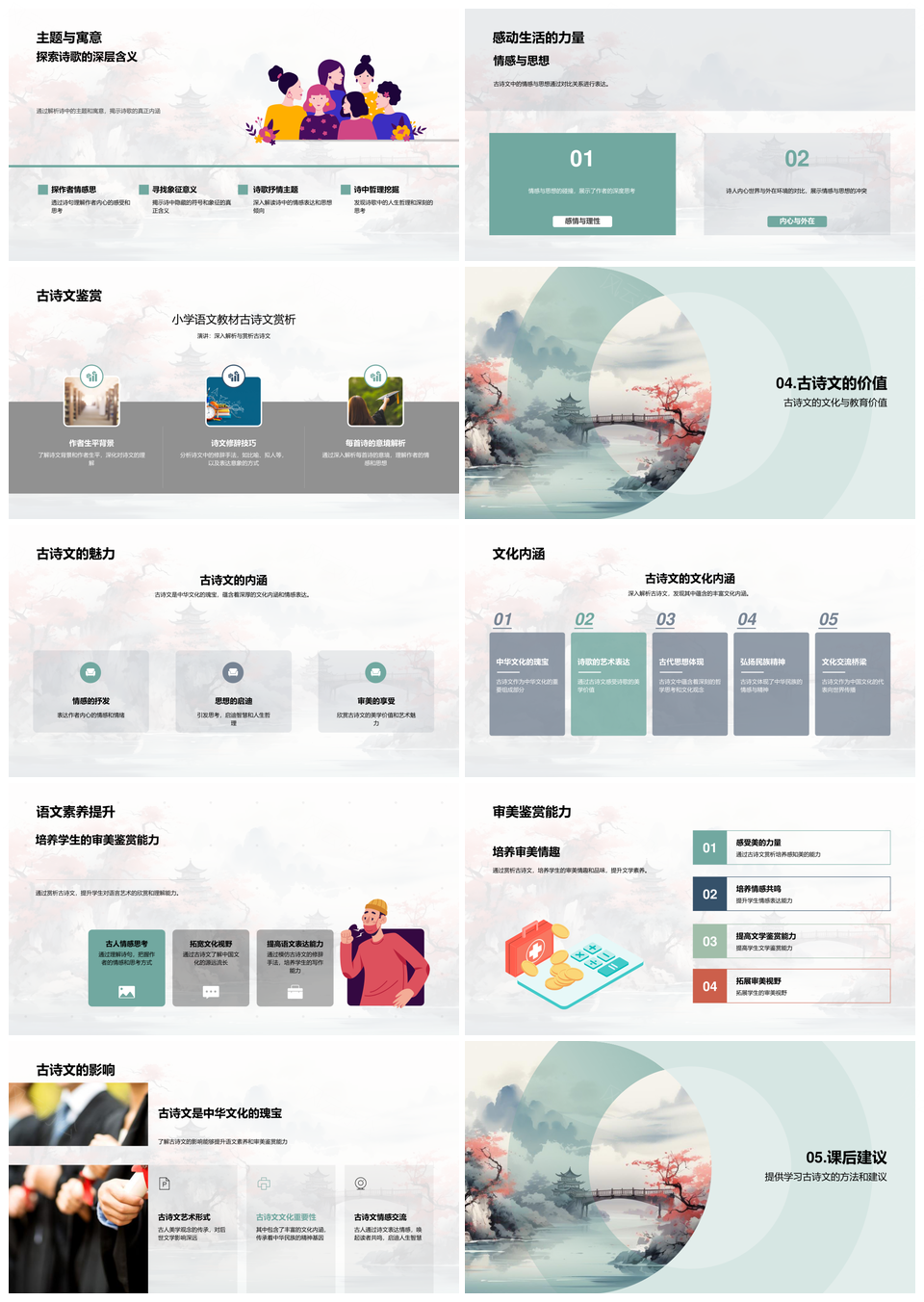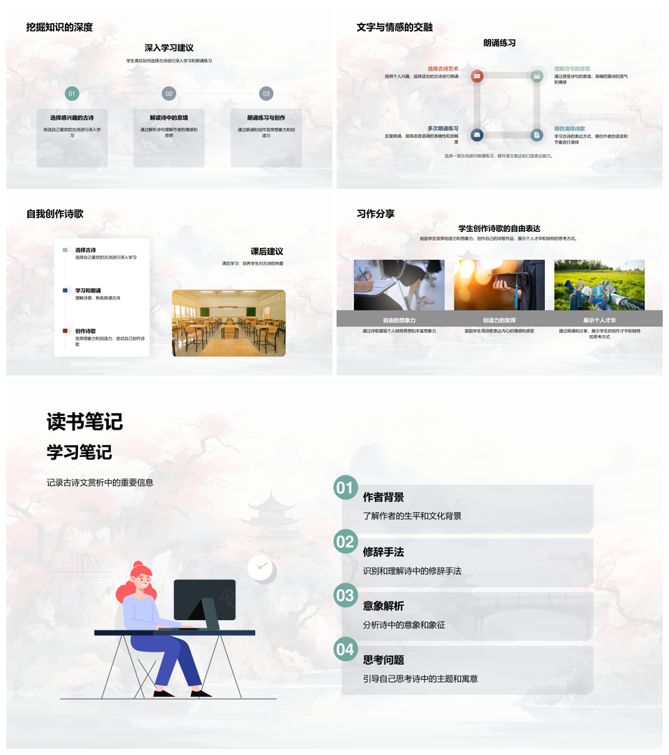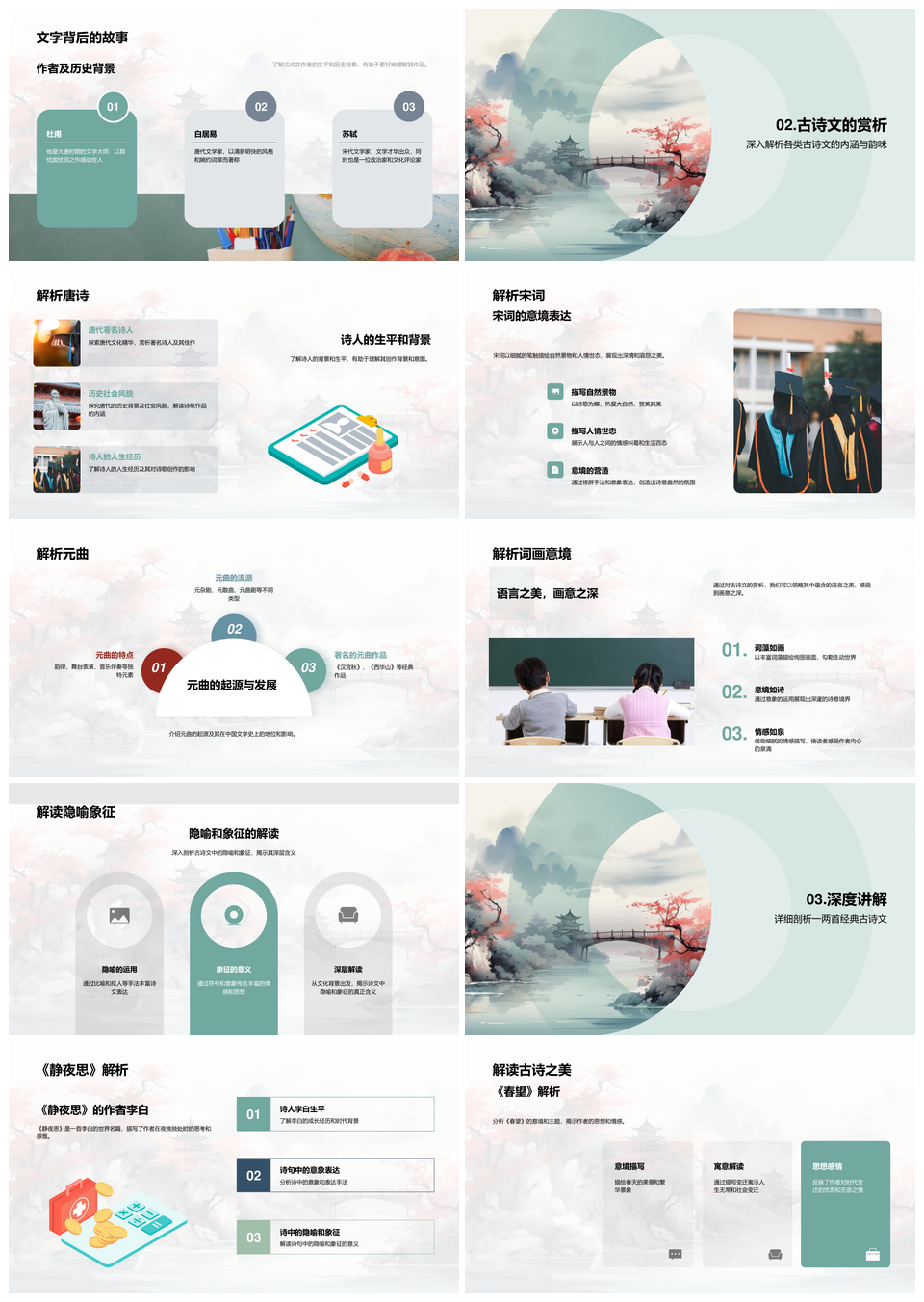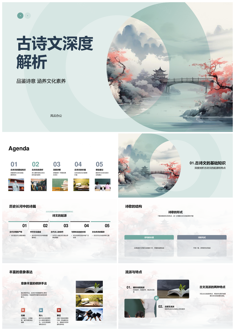 风云办公提供的小学古诗文深析修辞意象史境教育PPT模板,下载格式为pptx,一共33页,作品中文字及图均可以修改和编辑,图片更改请在作品中右键图片并更换,文字修改请直接点击文字进行修改。