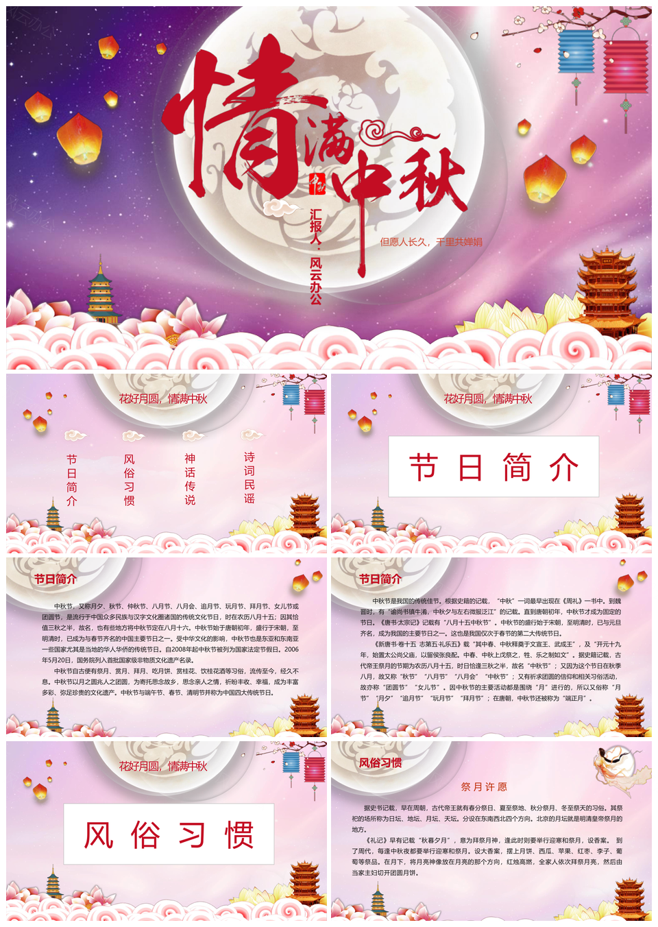 风云办公提供的简约唯美中秋节节日介绍PPT模板,下载格式为pptx,一共18页,作品中文字及图均可以修改和编辑,图片更改请在作品中右键图片并更换,文字修改请直接点击文字进行修改。