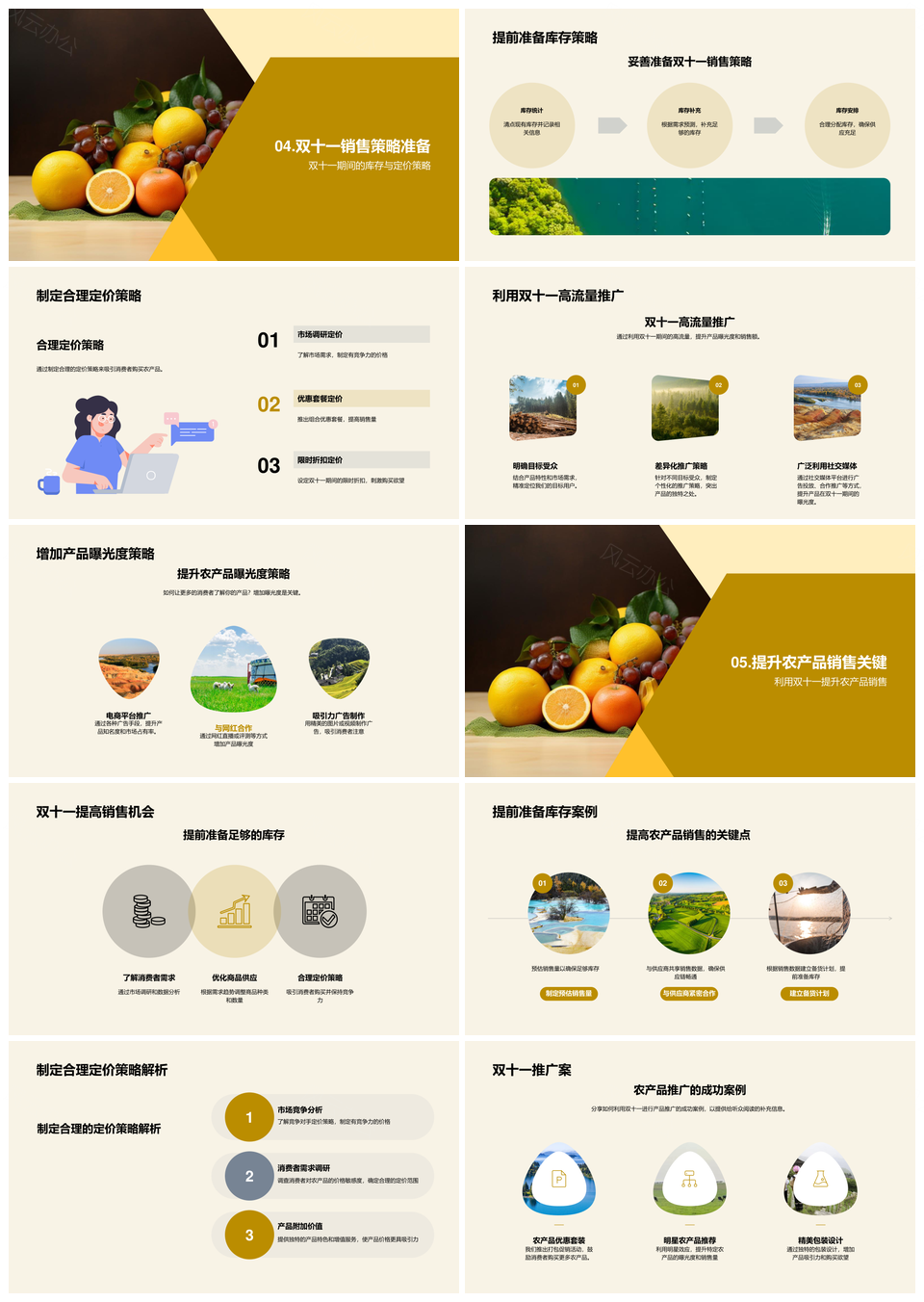 这是一张农产品双十一电商策略定价库存曝光果蔬攻略PPT模板,包含农产品、双十一、电商、策略、定价、库存、曝光、果蔬、攻略等主题内容,也可用作农产品双十一电商策略定价、双十一电商策略定价库存、电商策略定价库存曝光、策略定价库存曝光果蔬、双十一电商策略定价库存、农产品双十一定价库存曝光、双十一策略定价库存果蔬、电商定价库存曝光果蔬、农产品双十一电商策略、双十一电商库存曝光果蔬、策略库存曝光果蔬攻略、电商策略定价库存、双十一定价库存果蔬、库存曝光果蔬攻略、农产品双十一电商等PPT场景使用。 风云办公提供的农产品双十一电商策略定价库存曝光果蔬攻略PPT模板,下载格式为pptx,一共28页,作品中文字及图均可以修改和编辑,图片更改请在作品中右键图片并更换,文字修改请直接点击文字进行修改。