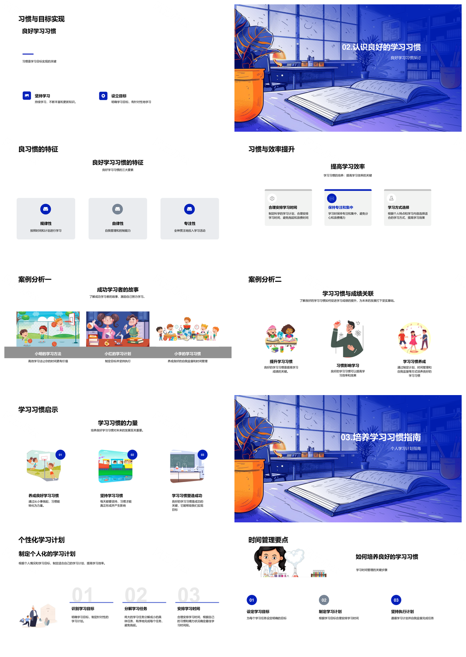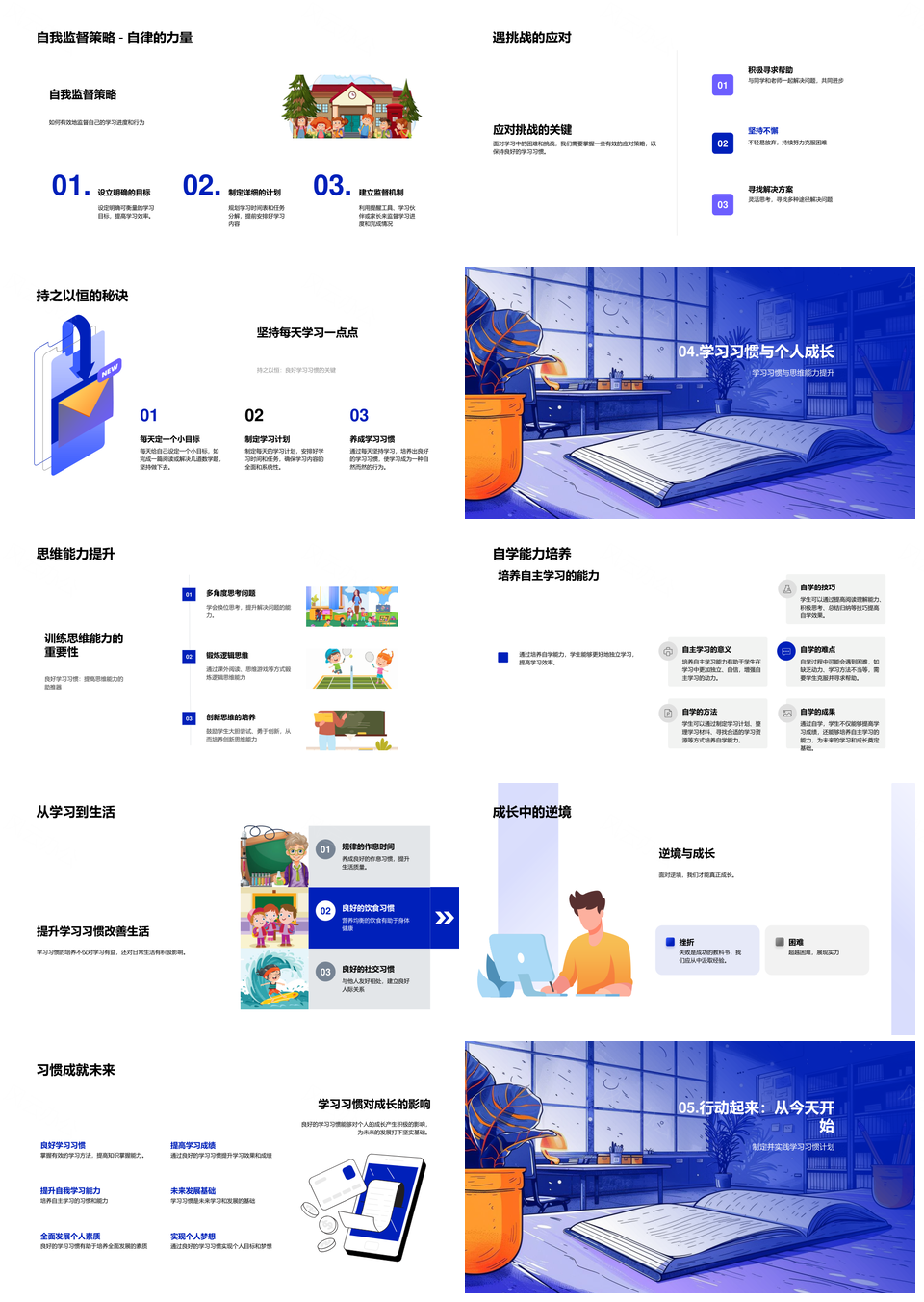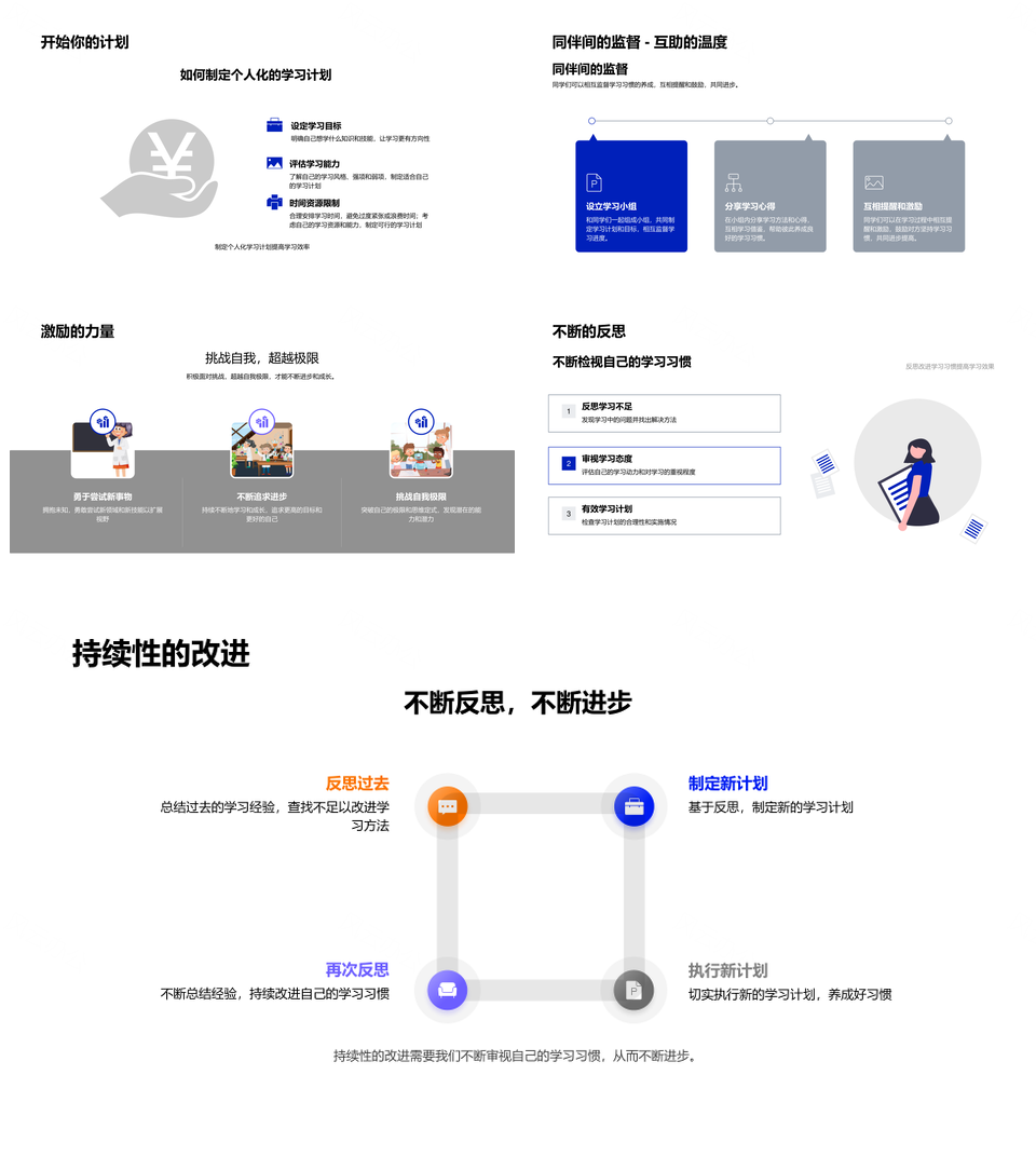 这是一张高效学习习惯建设成绩提升时间管理自我监督PPT模板,包含高效学习、习惯建设、成绩提升、时间管理、自我监督等主题内容,也可用作高效学习习惯建设、学习习惯建设成绩、习惯建设成绩提升、成绩提升时间管理、时间管理自我监督、高效学习习惯、学习习惯建设、习惯建设成绩、成绩提升时间、提升时间管理、时间管理自我、高效学习、学习习惯、成绩提升、时间管理、自我监督等PPT场景使用。 风云办公提供的高效学习习惯建设成绩提升时间管理自我监督PPT模板,下载格式为pptx,一共33页,作品中文字及图均可以修改和编辑,图片更改请在作品中右键图片并更换,文字修改请直接点击文字进行修改。