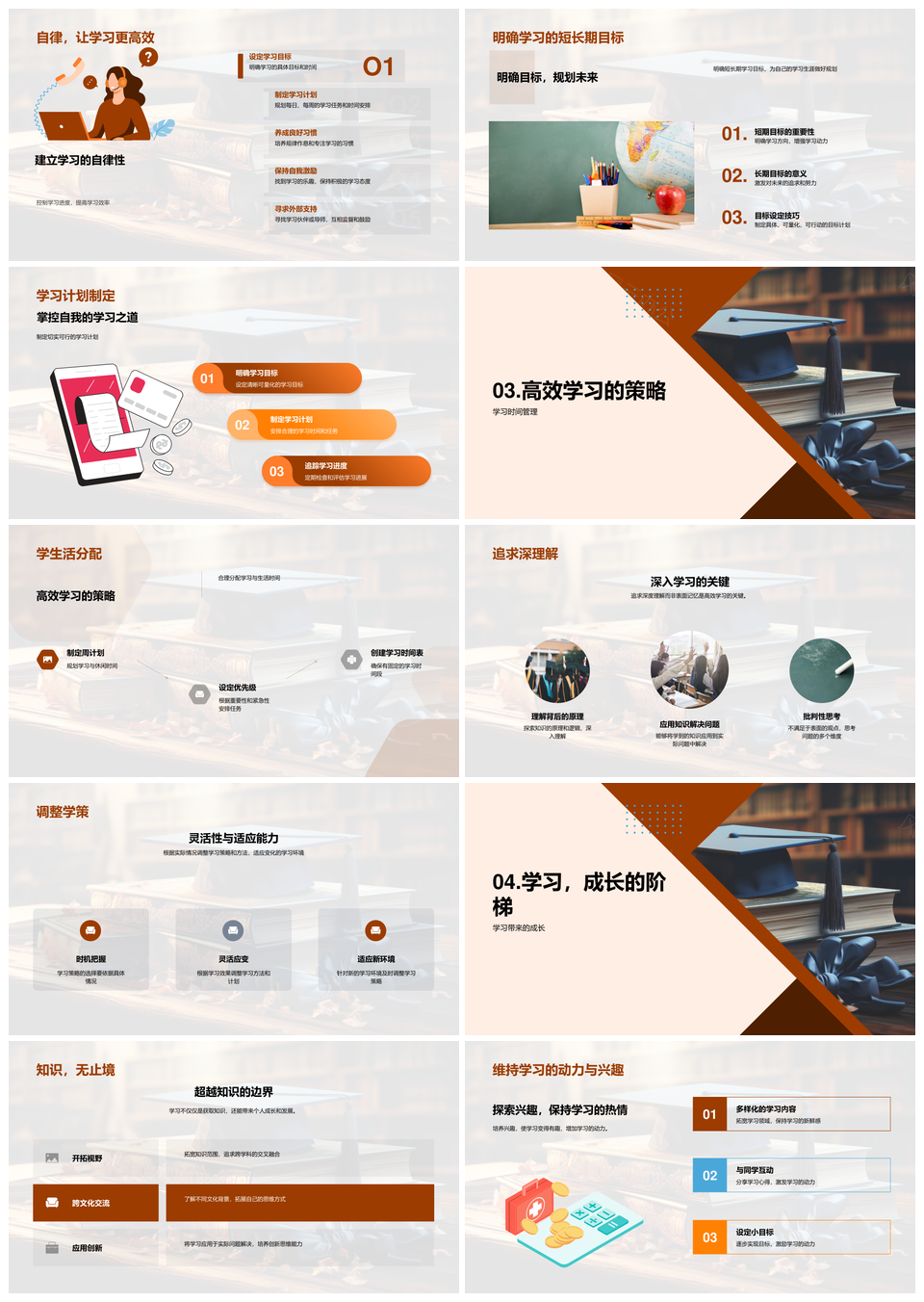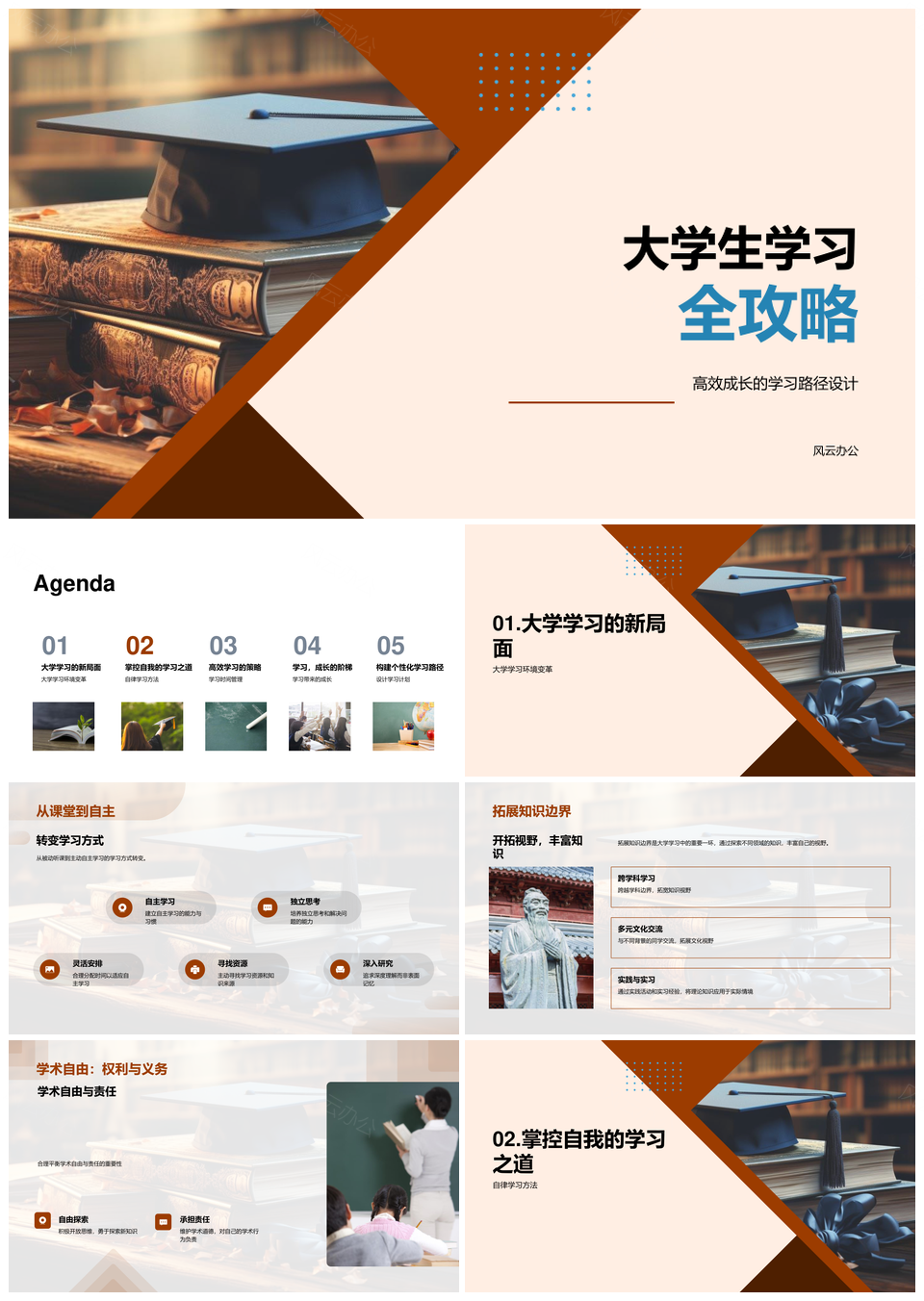 风云办公提供的大学生学习攻略学术自由责任自律书PPT模板,下载格式为pptx,一共23页,作品中文字及图均可以修改和编辑,图片更改请在作品中右键图片并更换,文字修改请直接点击文字进行修改。