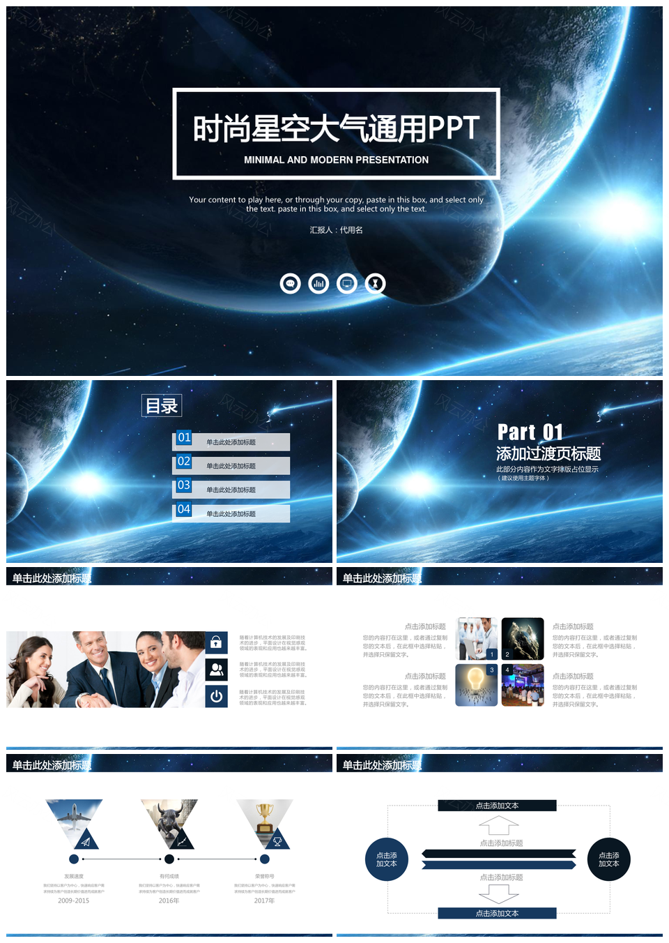 风云办公提供的时尚星空商务工作总结计划动态PPT模板,下载格式为pptx,一共28页,作品中文字及图均可以修改和编辑,图片更改请在作品中右键图片并更换,文字修改请直接点击文字进行修改。