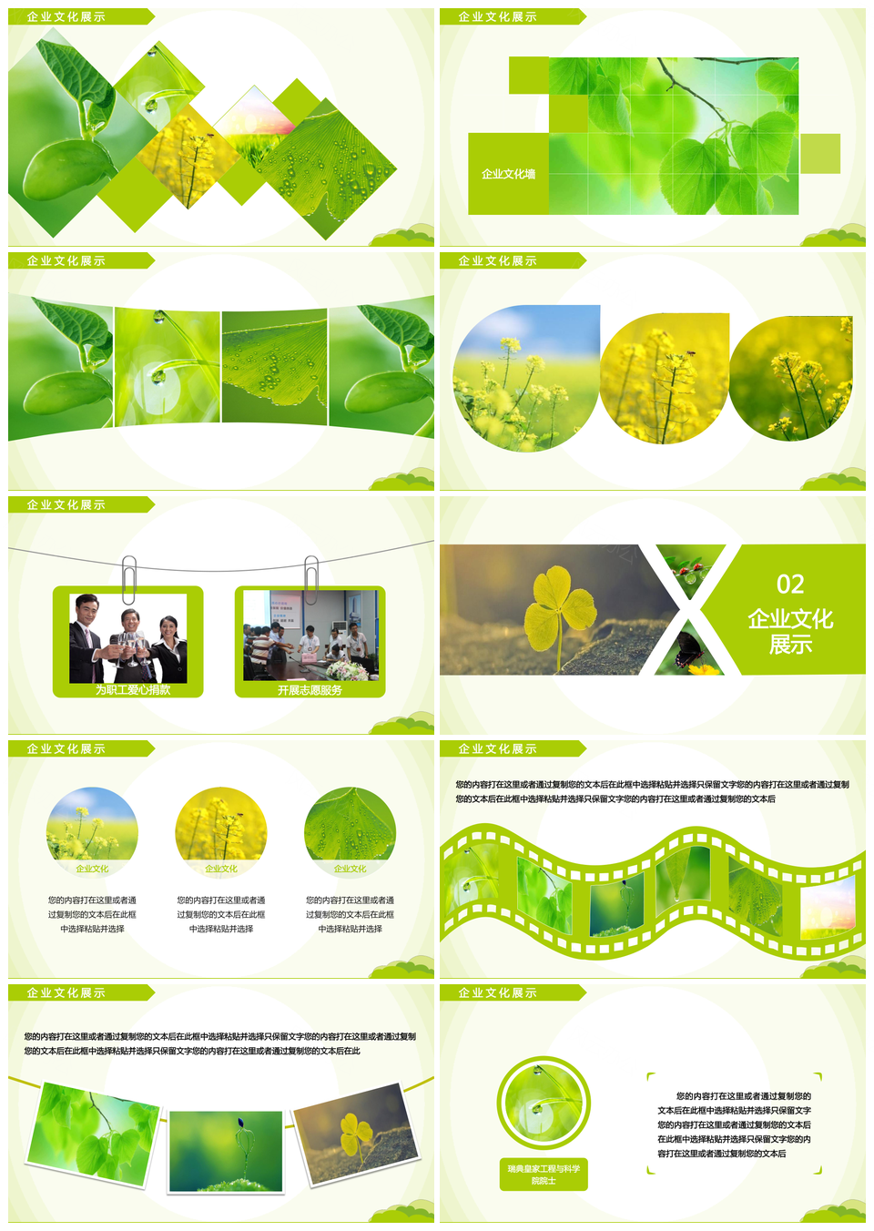 风云办公提供的绿色企业宣传PPT模板小清新动态可编辑,下载格式为pptx,一共37页,作品中文字及图均可以修改和编辑,图片更改请在作品中右键图片并更换,文字修改请直接点击文字进行修改。