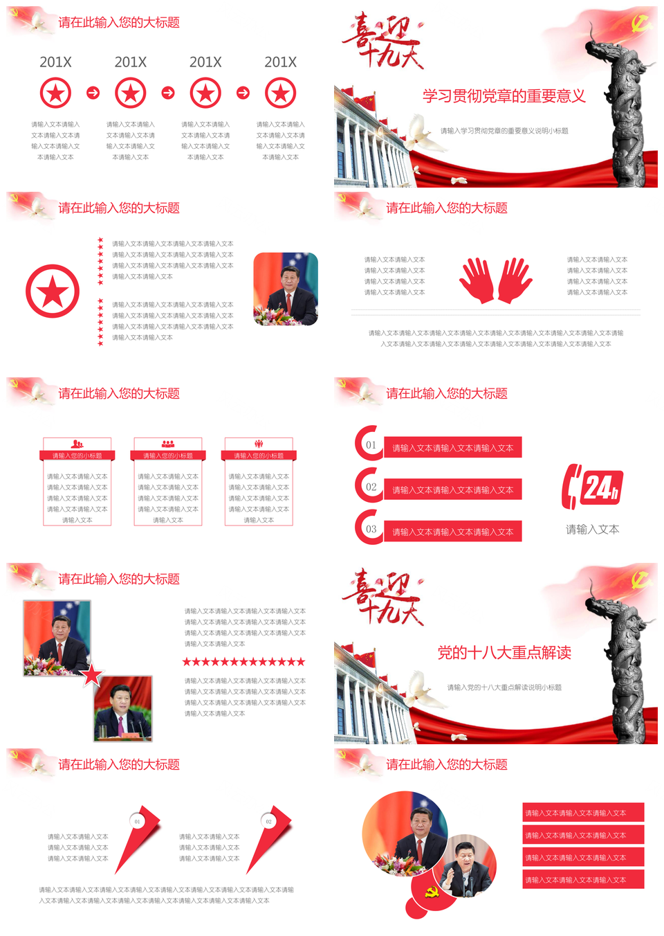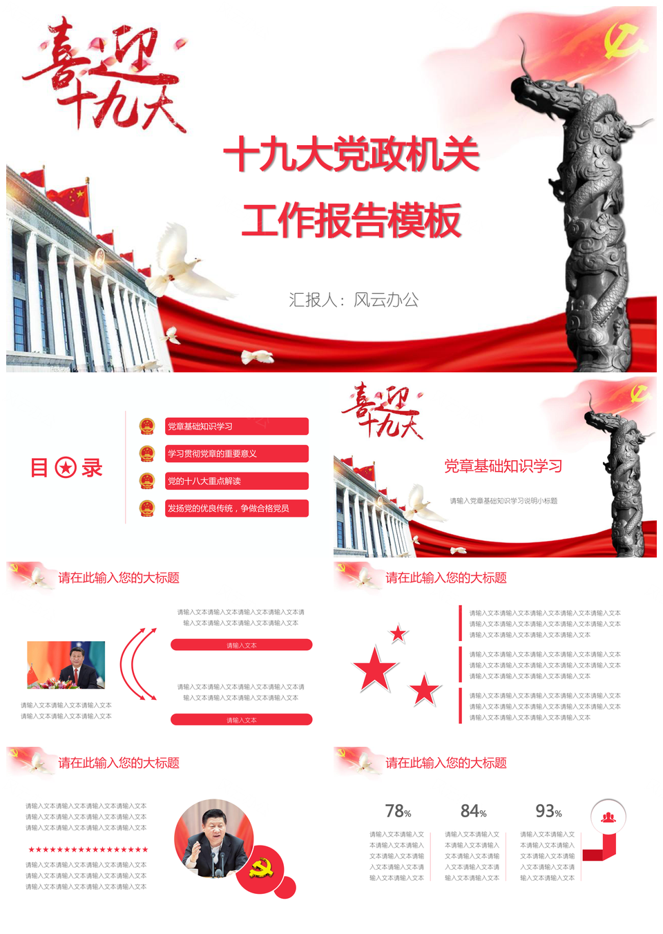 风云办公提供的红色十九大党政机关工作报告PPT模板,下载格式为pptx,一共27页,作品中文字及图均可以修改和编辑,图片更改请在作品中右键图片并更换,文字修改请直接点击文字进行修改。