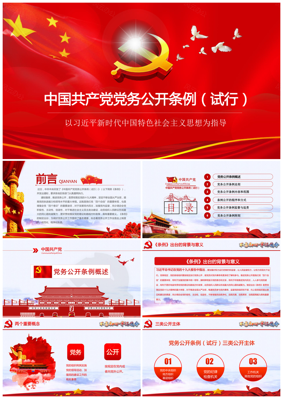 这是一张红色十九大党务公开PPT模板,包含红色、中国共产党、十九大、党务公开、条例、课件等主题内容,也可用作中国共产党十九大党务公开条例、红色中国共产党十九大党务、十九大党务公开条例课件、红色中国共产党十九大、中国共产党十九大党务、十九大党务公开条例、党务公开条例课件、红色中国共产党、中国共产党十九大、十九大党务公开、党务公开条例、条例课件等PPT场景使用。
