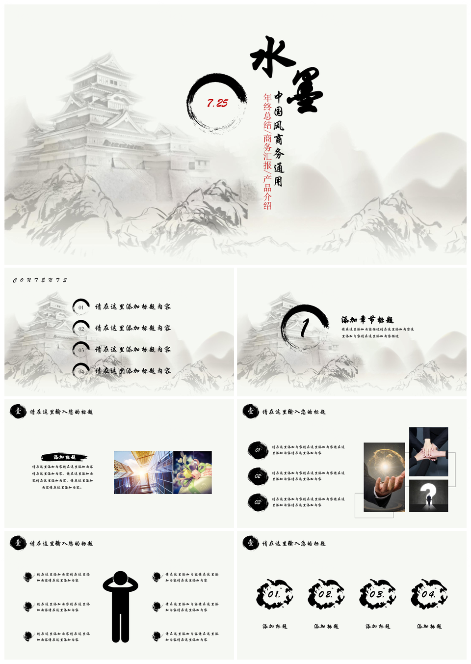 风云办公提供的灰色中国风水墨高雅通用商务总结PPT模板,下载格式为pptx,一共22页,作品中文字及图均可以修改和编辑,图片更改请在作品中右键图片并更换,文字修改请直接点击文字进行修改。
