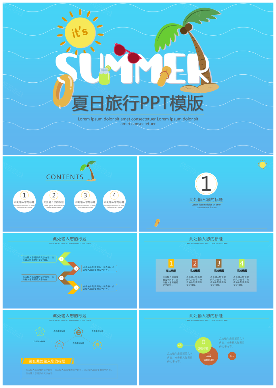这是一张卡通可爱小清新夏日旅行PPT模板,包含卡通、可爱、小清新、夏日、旅行等主题内容,也可用作卡通、可爱、小清新、夏日、旅行