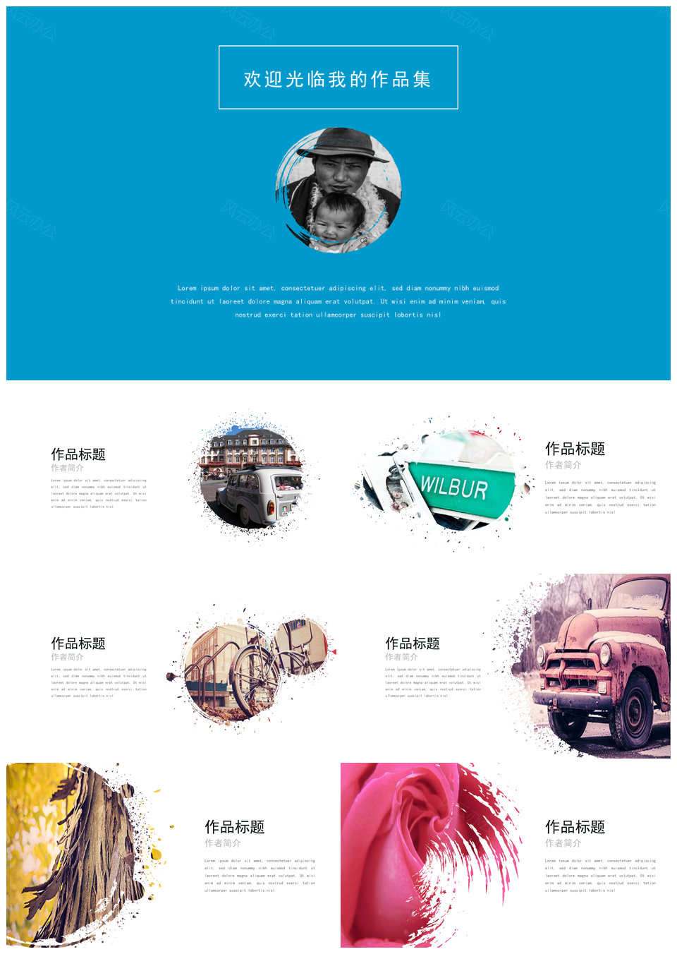 风云办公提供的高质量蓝色作品展示PPT模板,下载格式为pptx,一共10页,作品中文字及图均可以修改和编辑,图片更改请在作品中右键图片并更换,文字修改请直接点击文字进行修改。