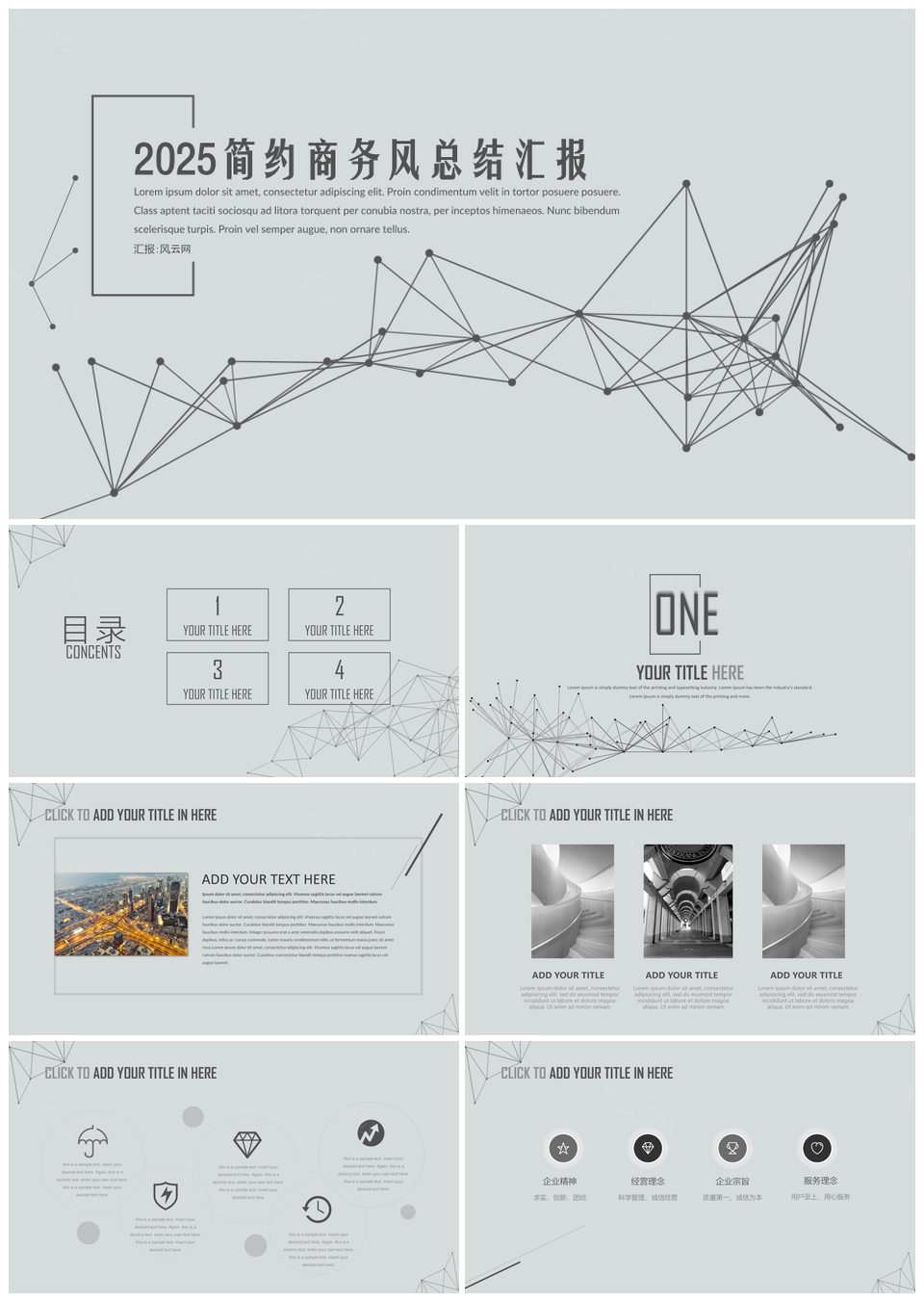 风云办公提供的精美灰色简约商务汇报总结计划PPT模板,下载格式为pptx,一共26页,作品中文字及图均可以修改和编辑,图片更改请在作品中右键图片并更换,文字修改请直接点击文字进行修改。