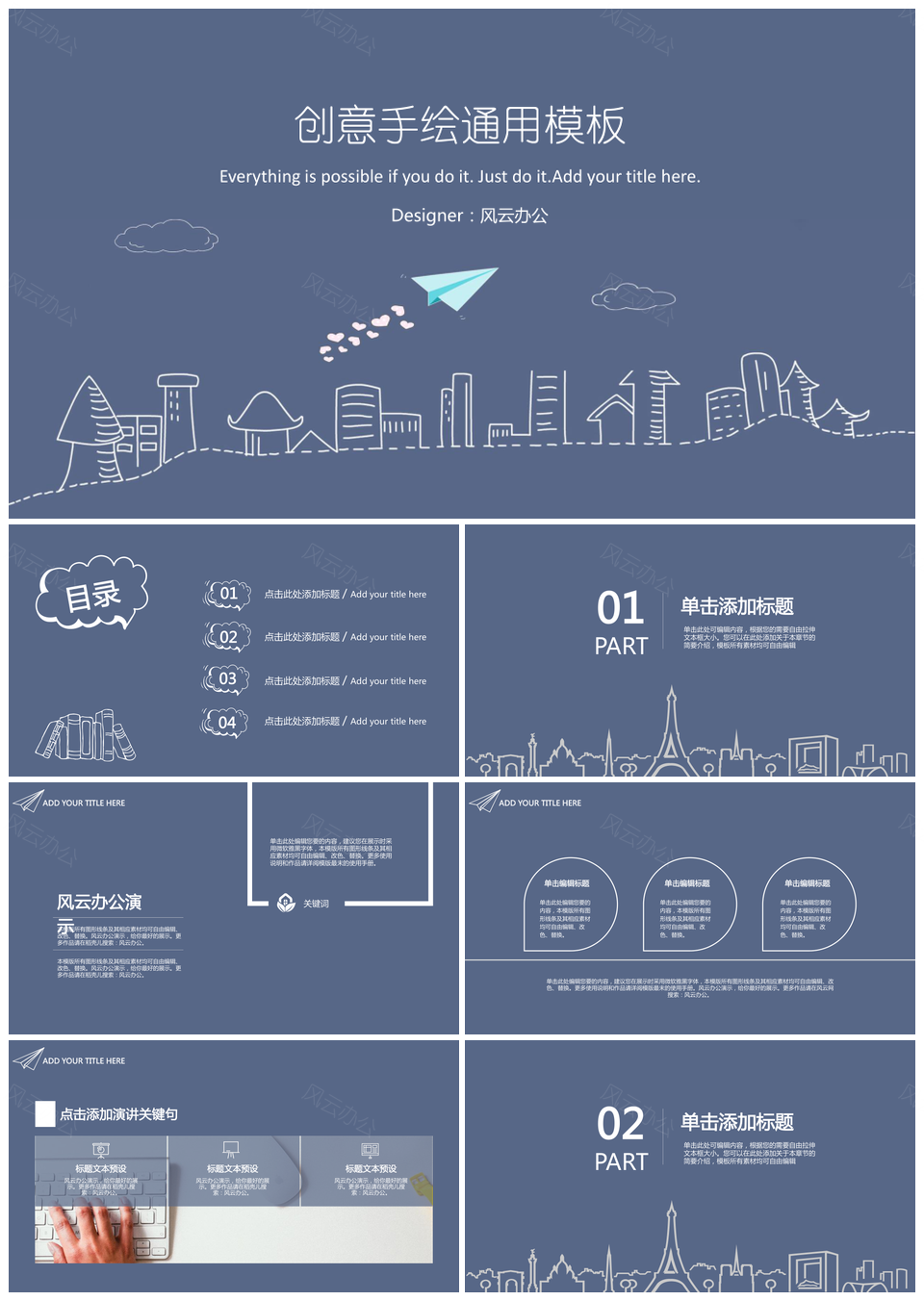 风云办公提供的精美蓝色手绘简约PPT模板,下载格式为pptx,一共17页,作品中文字及图均可以修改和编辑,图片更改请在作品中右键图片并更换,文字修改请直接点击文字进行修改。