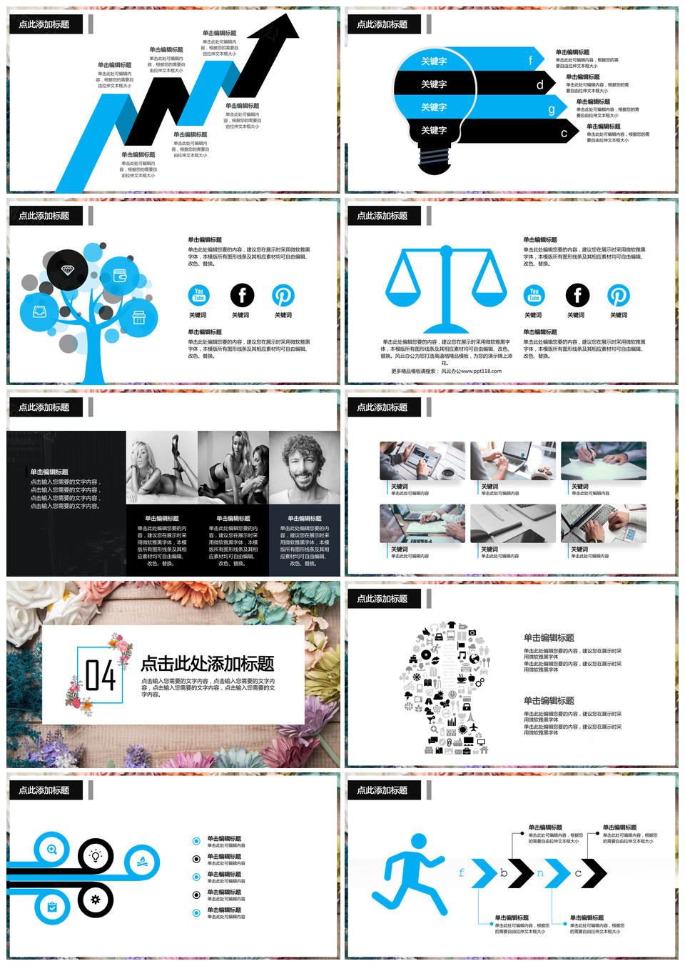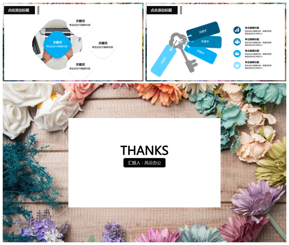 蓝色简约小清新精美花卉商务工作总结计划动态PPT模板