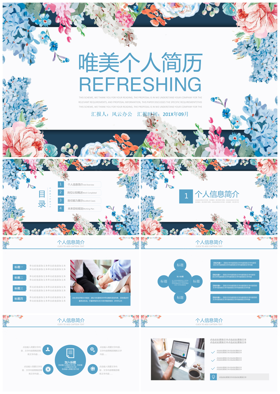 风云办公提供的唯美花卉个人简历求职个人介绍PPT模板,下载格式为pptx,一共23页,作品中文字及图均可以修改和编辑,图片更改请在作品中右键图片并更换,文字修改请直接点击文字进行修改。