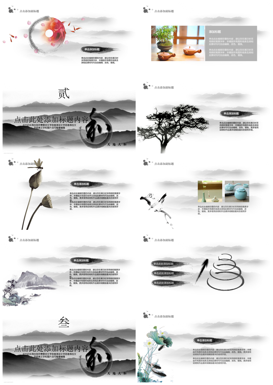 这是一张灰色中国风山水简约PPT模板,包含中国风、山水、简约等主题内容,也可用作中国风山水简约、灰色中国风山水、灰色山水简约、灰色中国风简约、灰色中国风、中国风山水、山水简约、灰色简约、中国风简约、灰色山水等PPT场景使用。 风云办公提供的灰色中国风山水简约PPT模板,下载格式为pptx,一共27页,作品中文字及图均可以修改和编辑,图片更改请在作品中右键图片并更换,文字修改请直接点击文字进行修改。