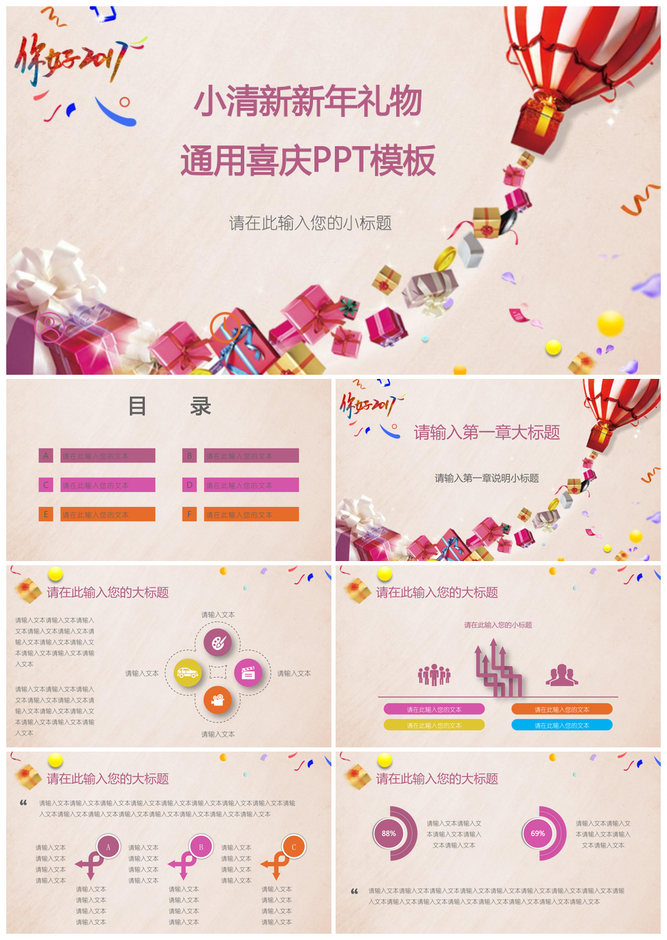 这是一张粉色新年礼物PPT模板,包含小清新、粉色、新年礼物、喜庆等主题内容,也可用作小清新粉色新年礼物喜庆、粉色新年礼物通用喜庆、小清新新年礼物通用喜庆、小清新粉色通用喜庆、小清新粉色新年礼物、粉色新年礼物喜庆、新年礼物通用喜庆、小清新通用喜庆、粉色通用喜庆、小清新粉色、粉色新年礼物、新年礼物通用、通用喜庆等PPT场景使用。 风云办公提供的粉色新年礼物PPT模板,下载格式为pptx,一共30页,作品中文字及图均可以修改和编辑,图片更改请在作品中右键图片并更换,文字修改请直接点击文字进行修改。