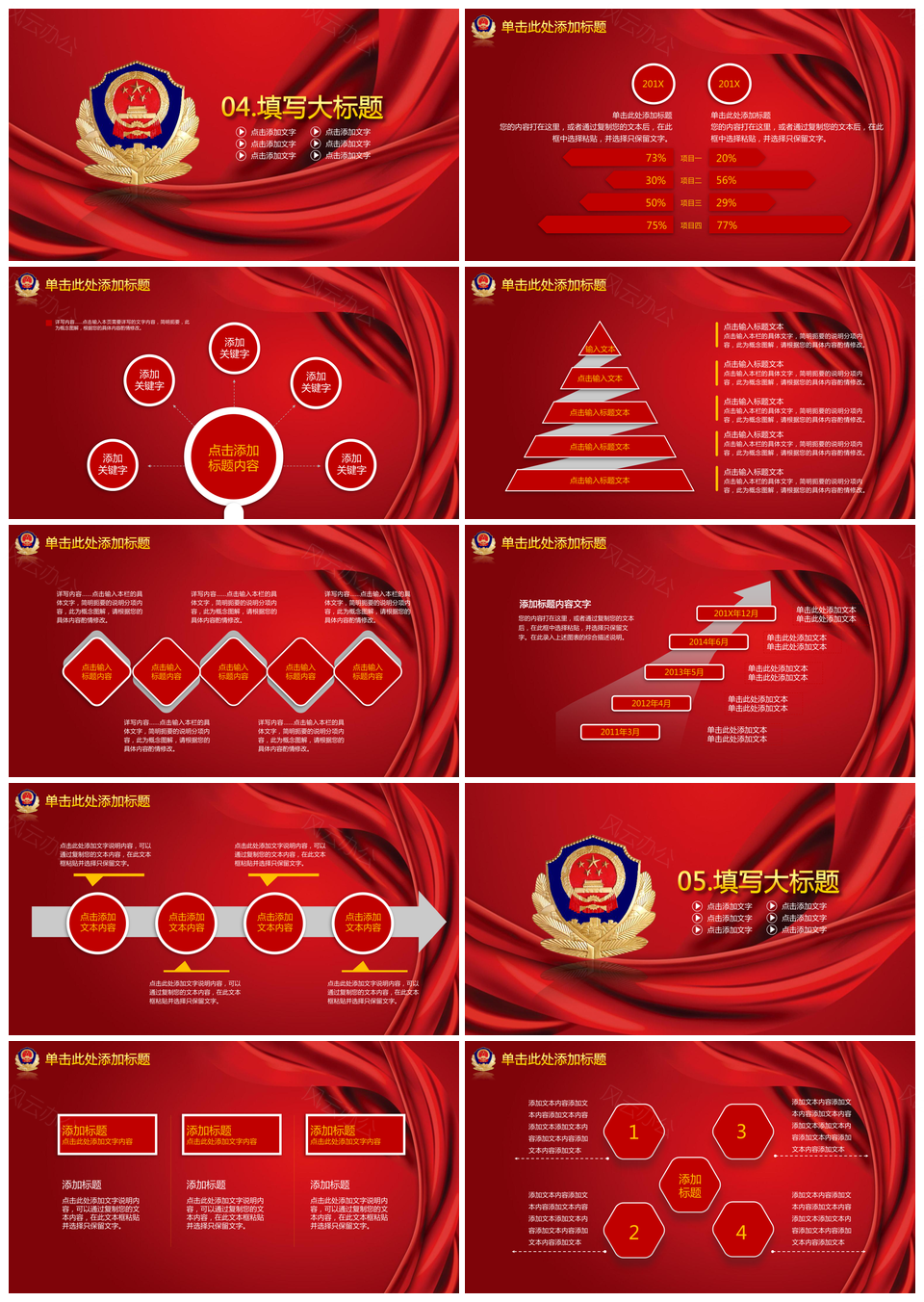 这是一张红色大气公安警务工作总结动态PPT模板,包含红色、大气、公安、警务、工作总结等主题内容,也可用作红色大气公安警务、公安警务工作总结动态、红色大气公安警务工作总结、公安警务工作总结、警务工作总结动态、红色大气、公安警务、工作总结、动态等PPT场景使用。 风云办公提供的红色大气公安警务工作总结动态PPT模板,下载格式为pptx,一共37页,作品中文字及图均可以修改和编辑,图片更改请在作品中右键图片并更换,文字修改请直接点击文字进行修改。