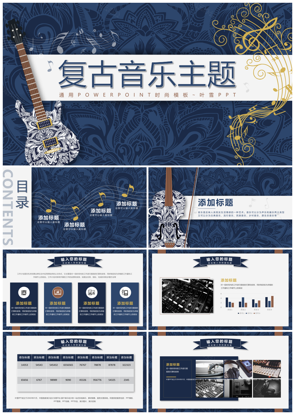 这是一张蓝色复古音乐动态PPT模板,包含蓝色、复古、音乐、主题等主题内容,也可用作蓝色复古音乐主题、复古音乐主题动态、蓝色复古音乐、复古音乐主题、音乐主题动态、蓝色复古、复古音乐、音乐主题、主题动态等PPT场景使用。 风云办公提供的蓝色复古音乐动态PPT模板,下载格式为pptx,一共27页,作品中文字及图均可以修改和编辑,图片更改请在作品中右键图片并更换,文字修改请直接点击文字进行修改。