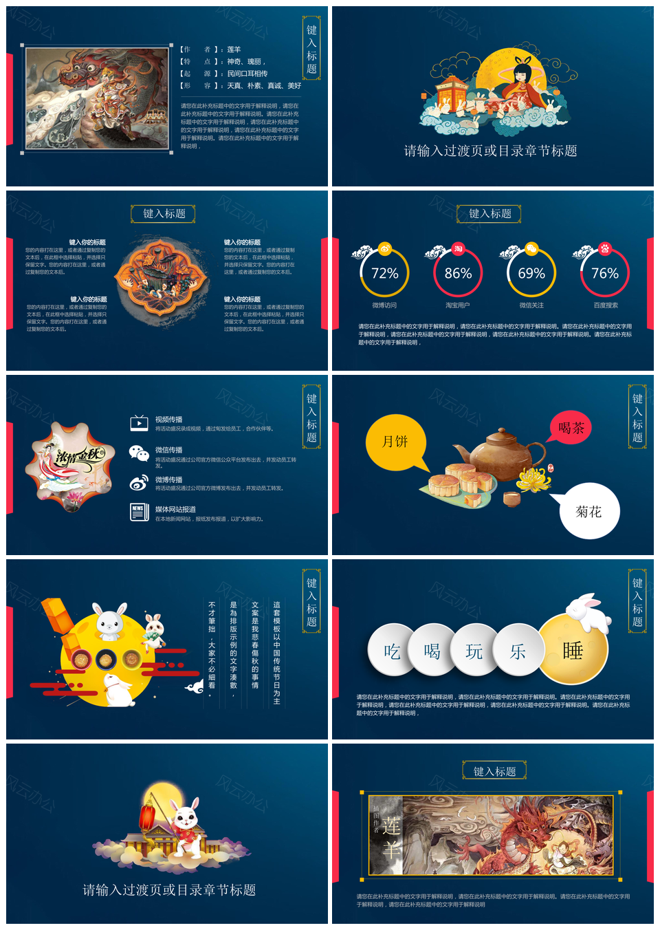 风云办公提供的高质量蓝色中国风节日PPT模板,下载格式为pptx,一共72页,作品中文字及图均可以修改和编辑,图片更改请在作品中右键图片并更换,文字修改请直接点击文字进行修改。