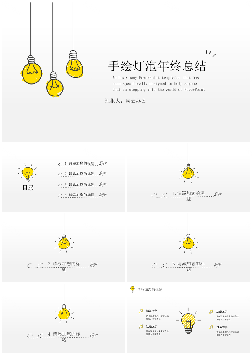 这是一张黄色手绘灯泡年终汇报PPT模板可编辑,包含黄色、手绘、灯泡、年终、汇报等主题内容,也可用作手绘灯泡年终汇报、黄色手绘灯泡年终、手绘灯泡年终、黄色手绘灯泡、灯泡年终汇报、黄色手绘年终、黄色灯泡年终、手绘年终汇报、黄色年终汇报、黄色手绘、手绘灯泡、灯泡年终、年终汇报、黄色灯泡等PPT场景使用。 风云办公提供的黄色手绘灯泡年终汇报PPT模板可编辑,下载格式为pptx,一共25页,作品中文字及图均可以修改和编辑,图片更改请在作品中右键图片并更换,文字修改请直接点击文字进行修改。