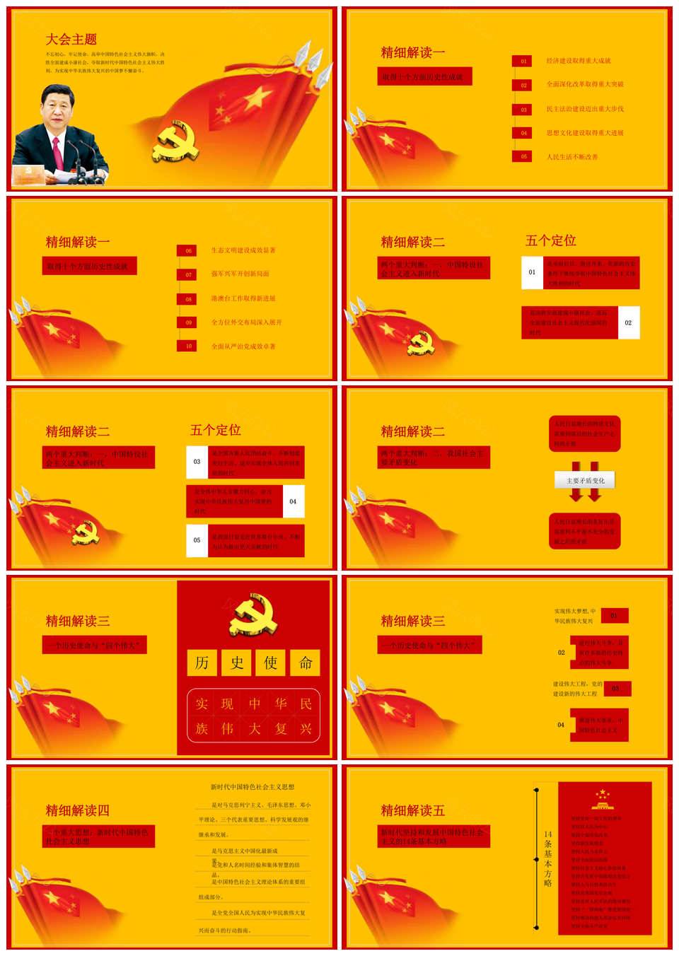 这是一张十九大解读PPT模板,包含中国共产党、十九大、精细解读等主题内容,也可用作中国共产党十九大精细解读、中国共产党十九大精细、中国共产党十九大解读、中国共产党精细解读、十九大精细解读、中国共产党十九大、十九大精细、十九大解读、精细解读等PPT场景使用。 风云办公提供的十九大解读PPT模板,下载格式为pptx,一共31页,作品中文字及图均可以修改和编辑,图片更改请在作品中右键图片并更换,文字修改请直接点击文字进行修改。